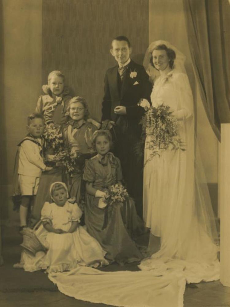 trouwfoto, echtpaar, bruidsjonker en bruidsmeisjes