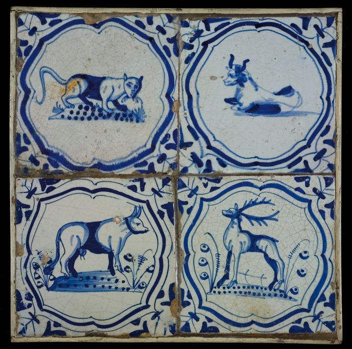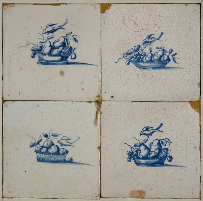 Tegelveld, vier tegels, vruchtendecor, blauw op wit,...