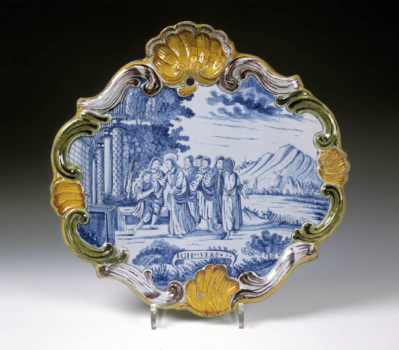 Bord met Simson en de leeuw (Re.14:5-9), in blauw, g...