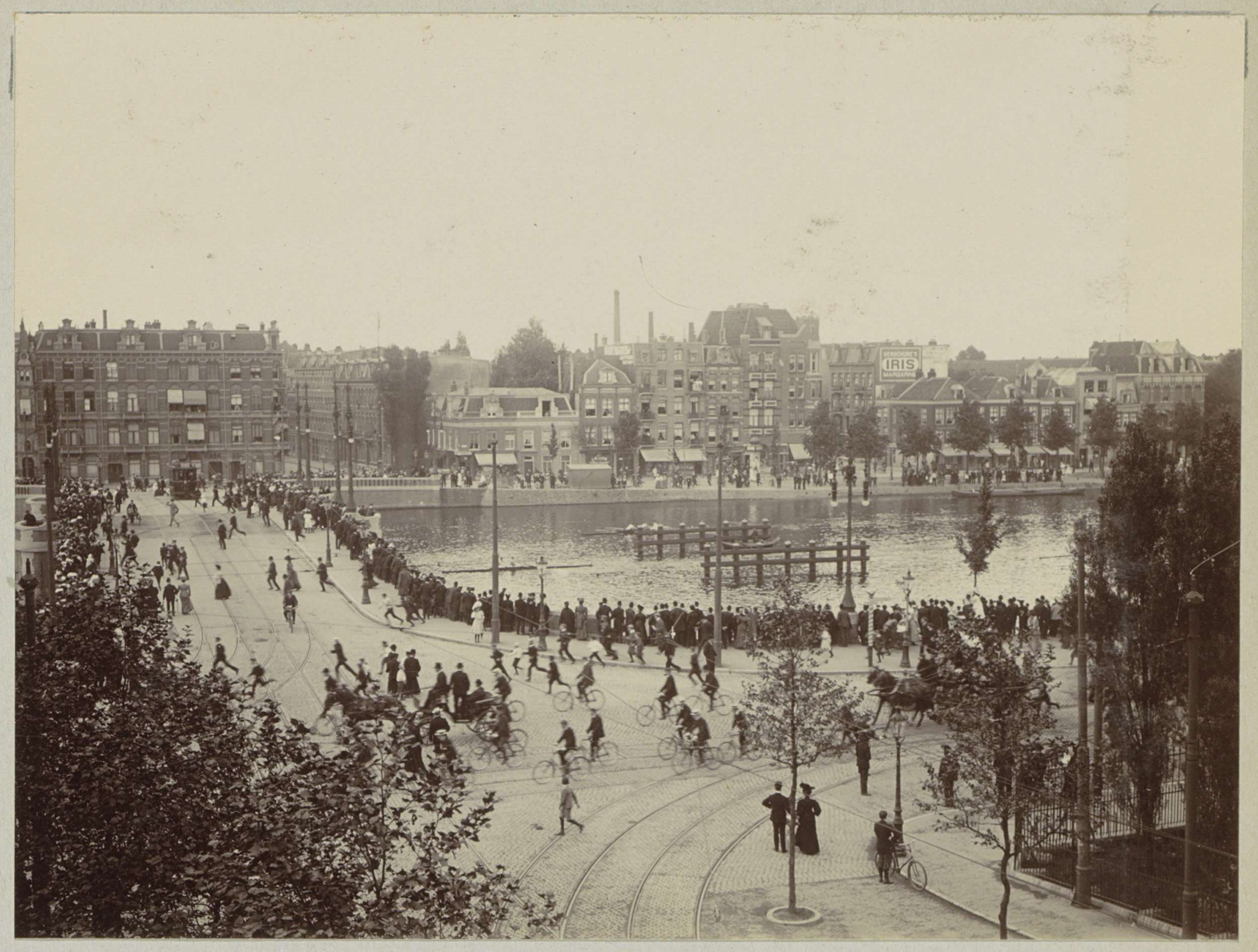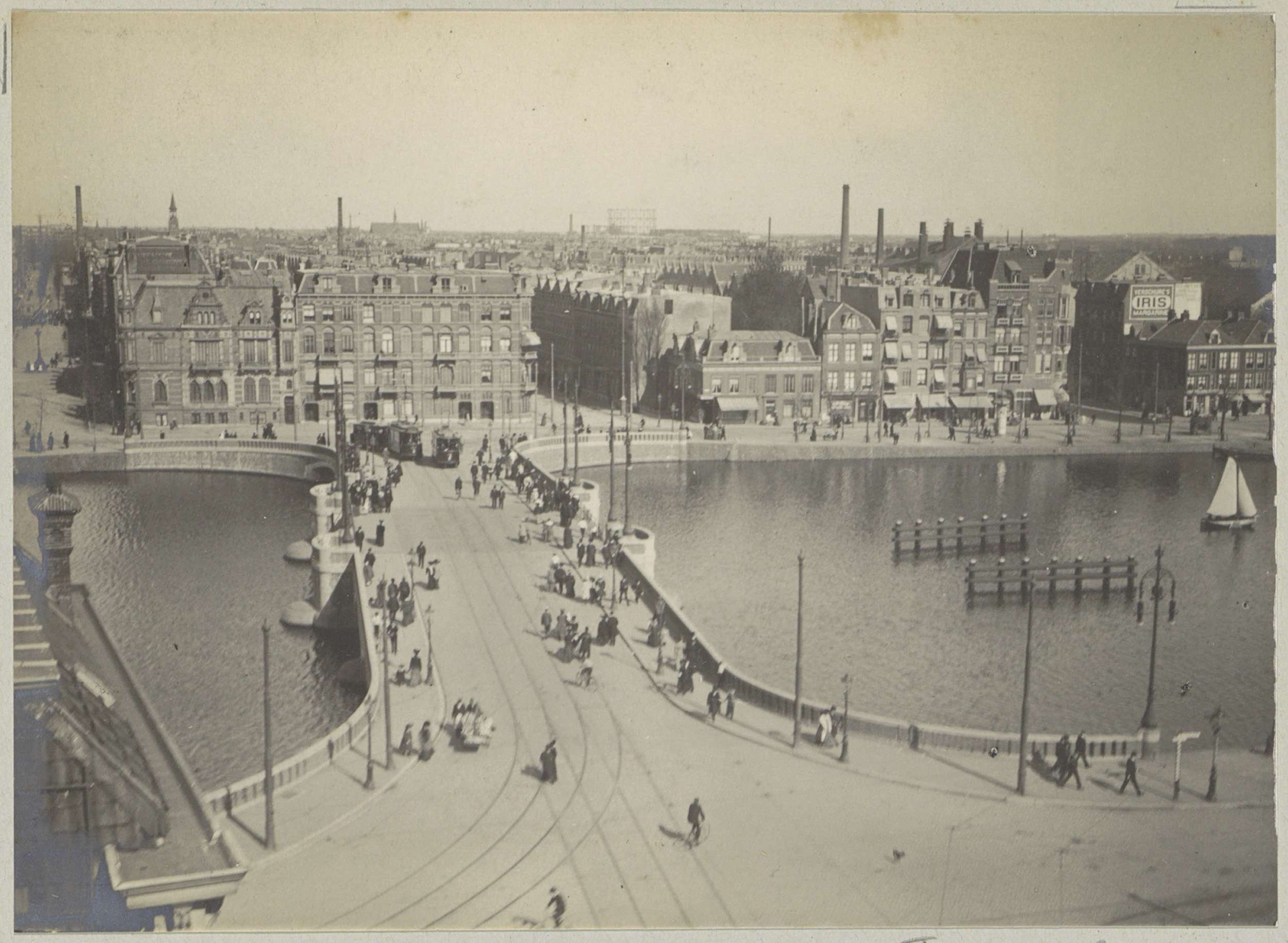 Drukte op de Nieuwe Amstelbrug, gezien richting Amst...