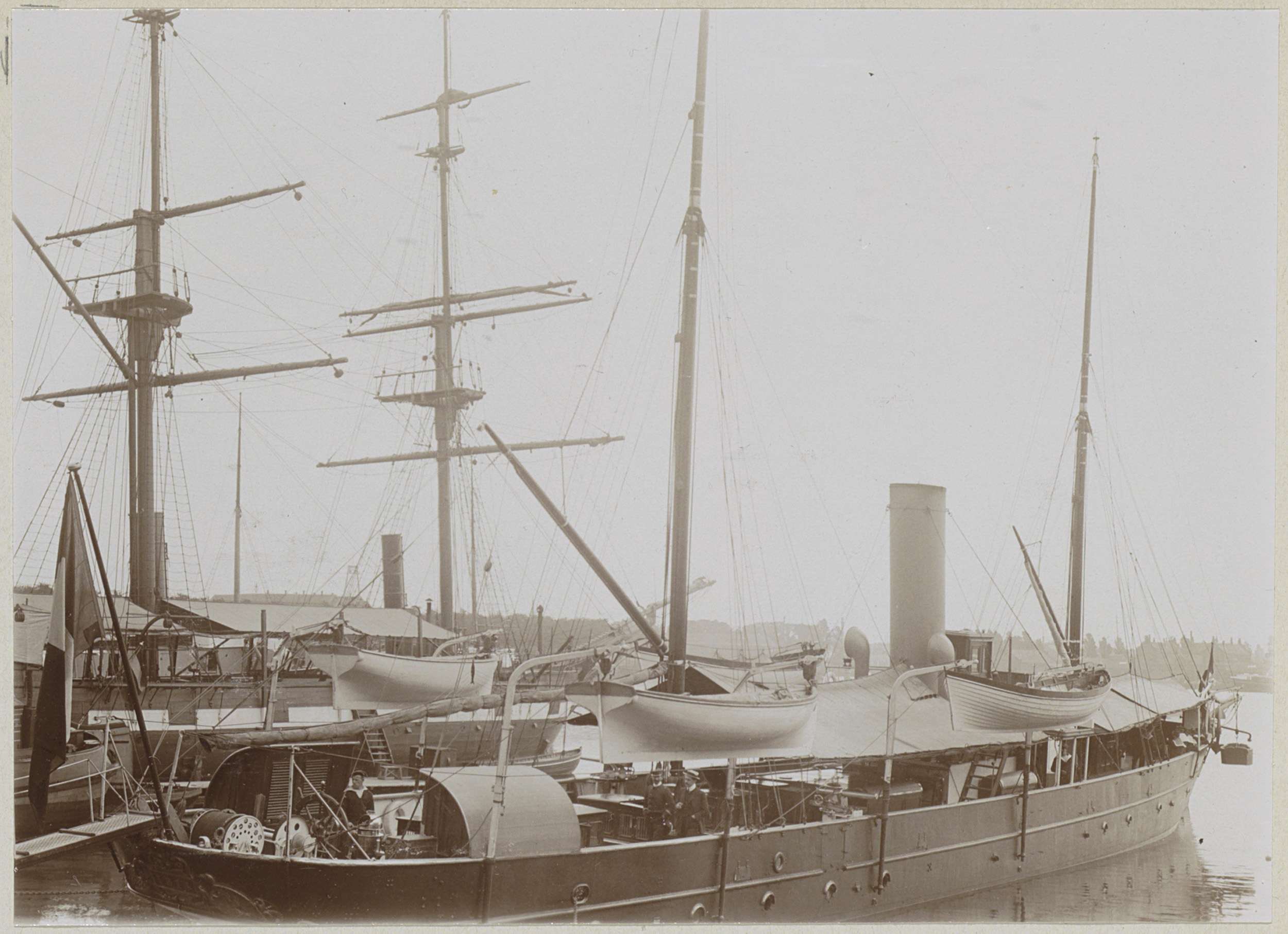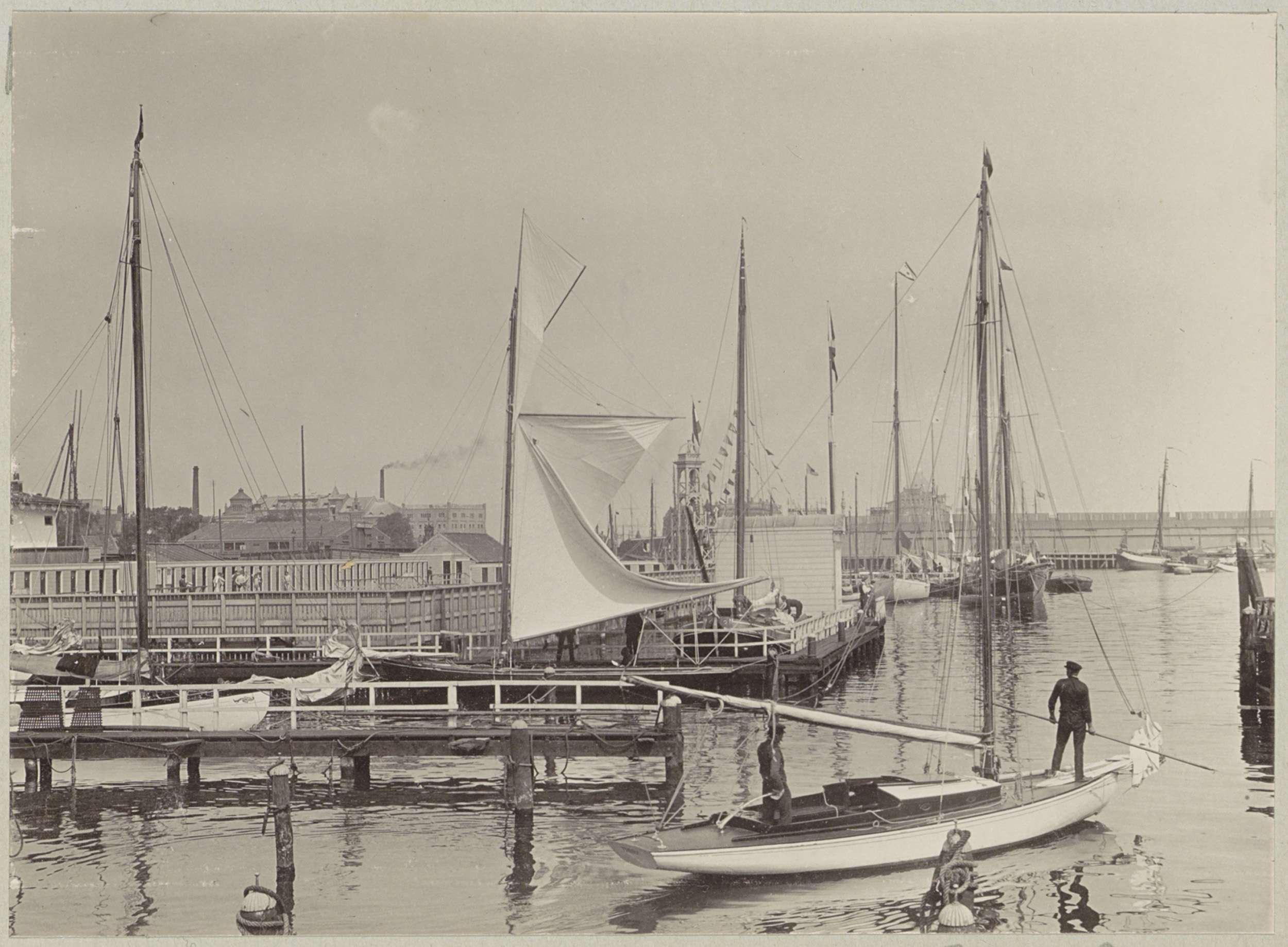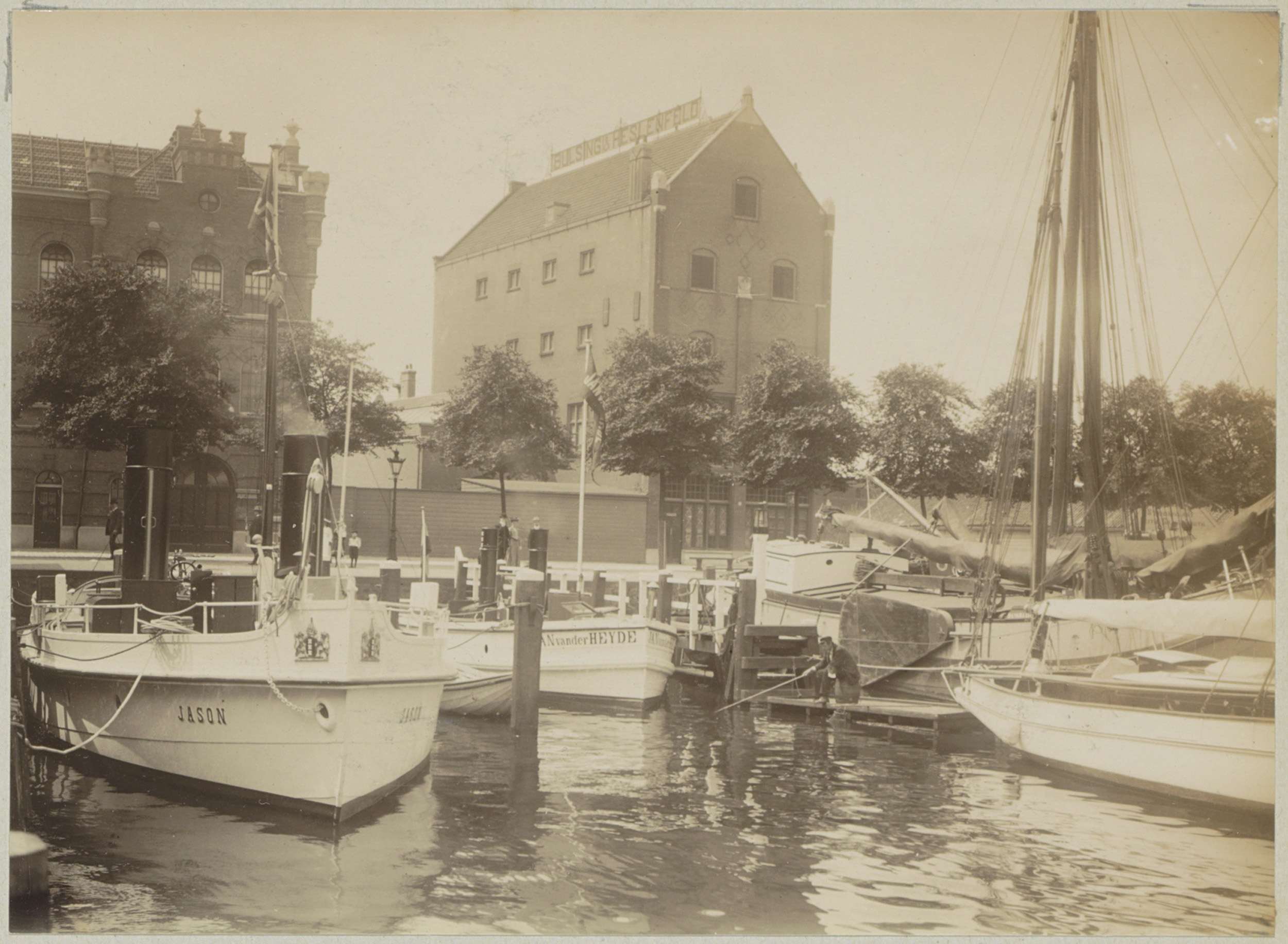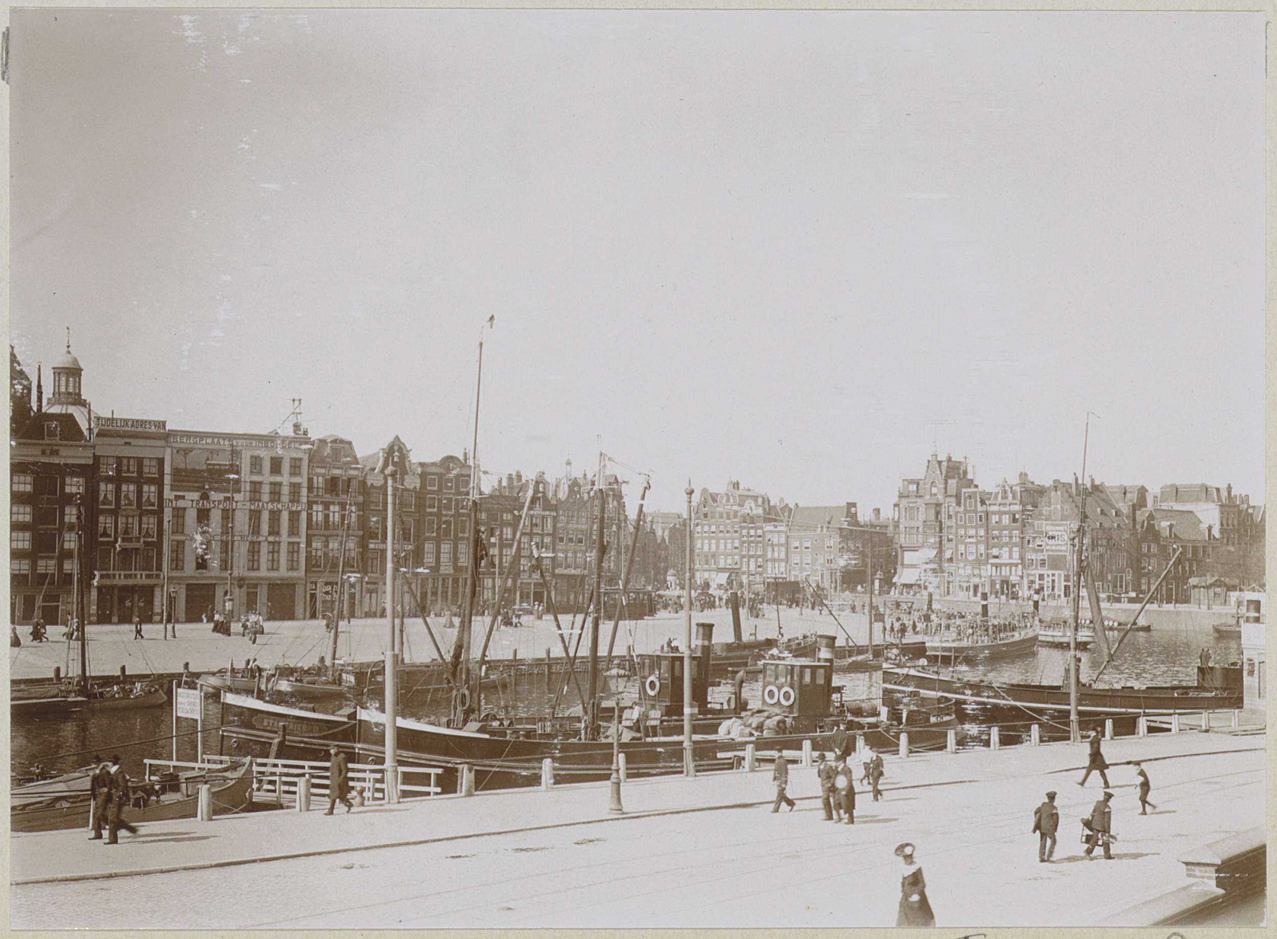 Schepen aangemeerd aan de Prins Hendrikkade met op d...
