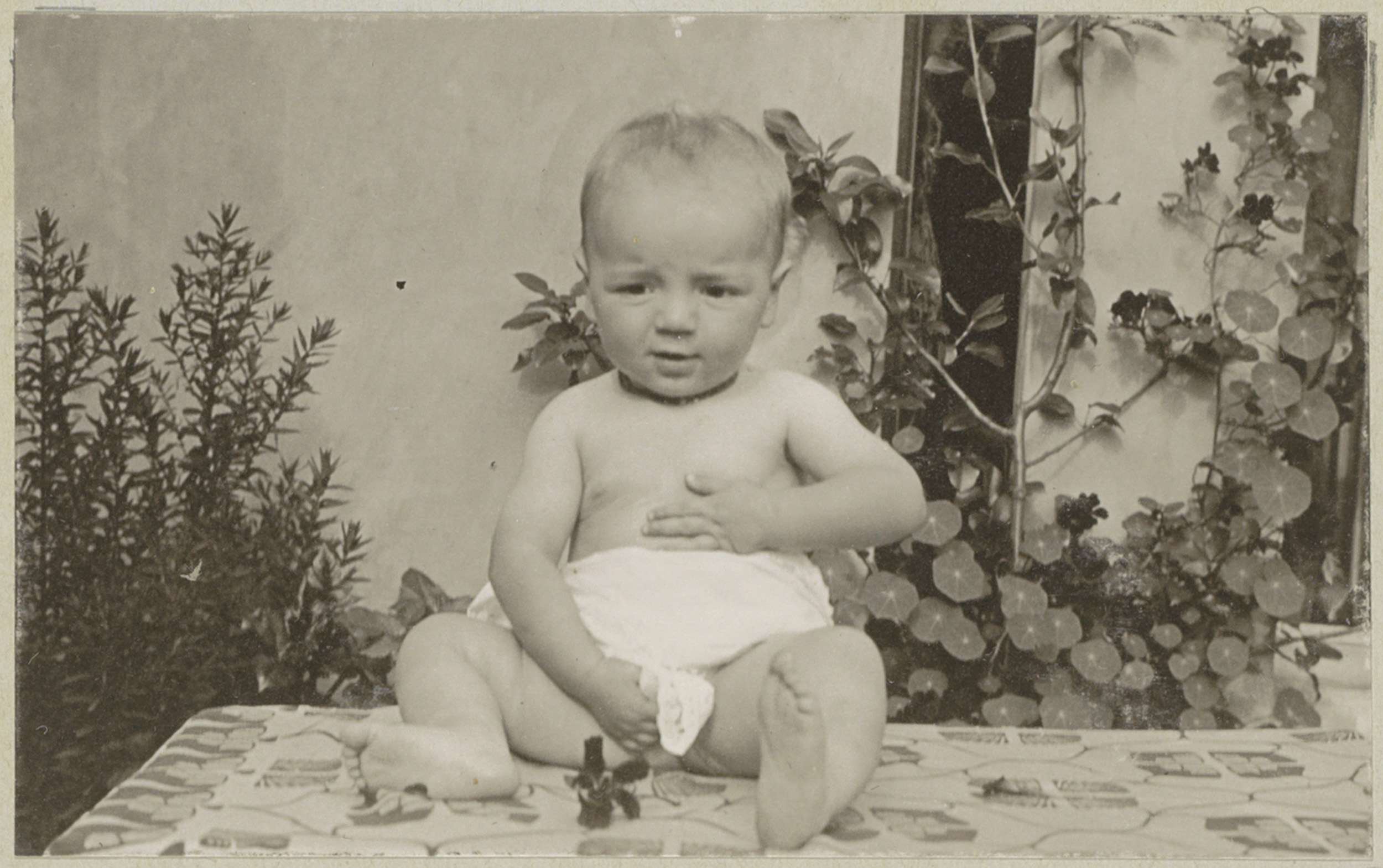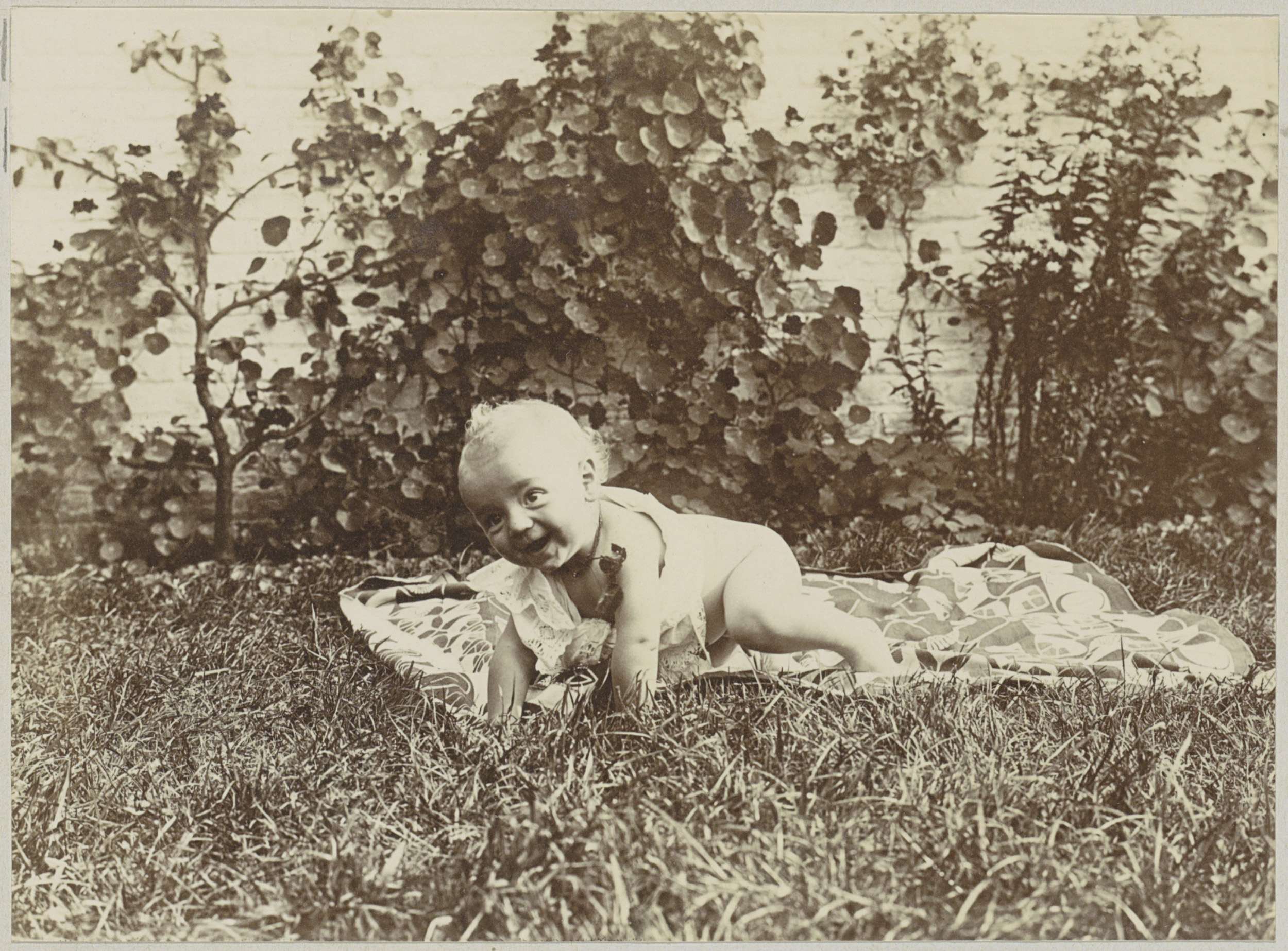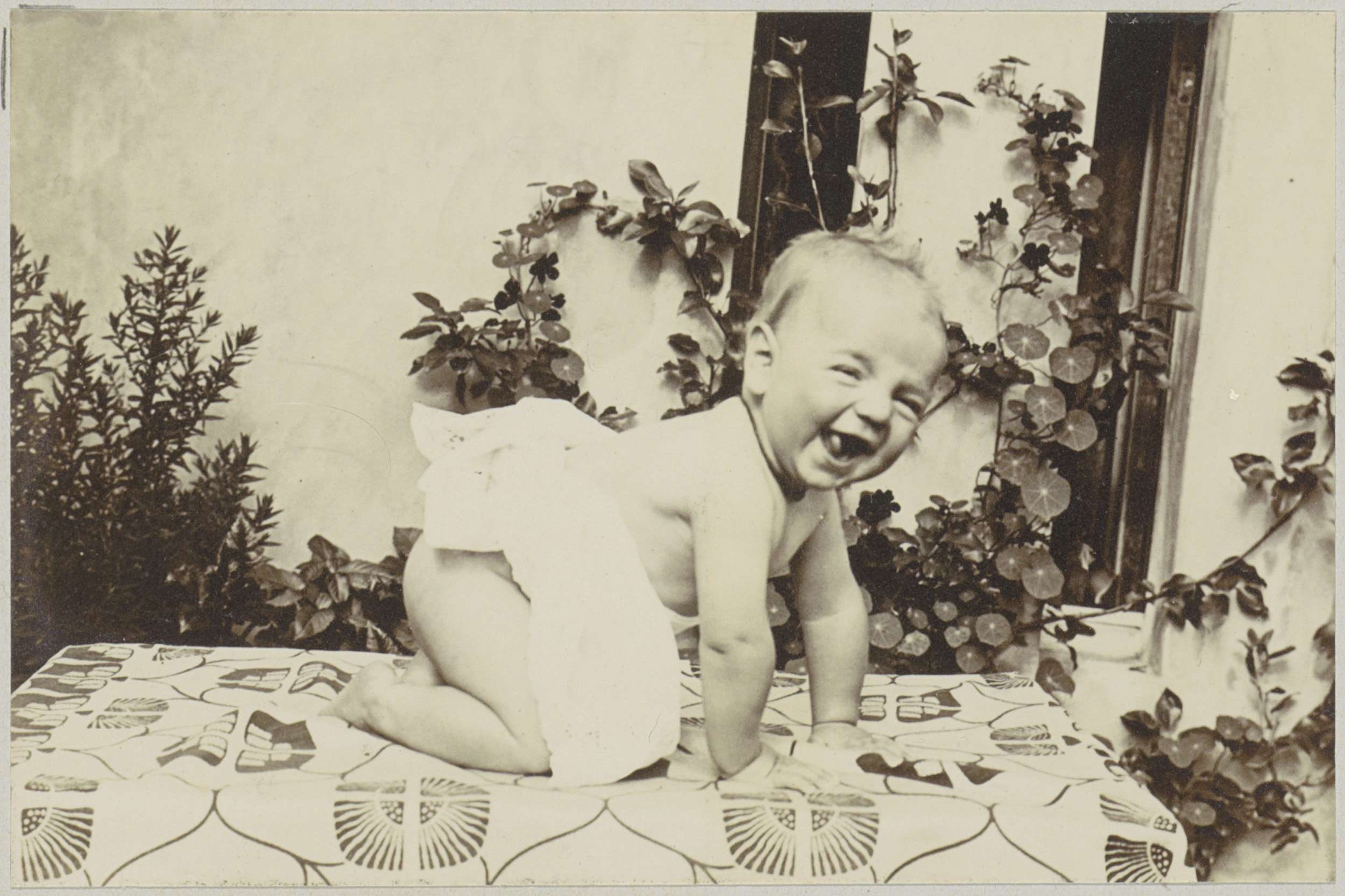Baby voelt aan buik en tussen de beentjes, zittend o...
