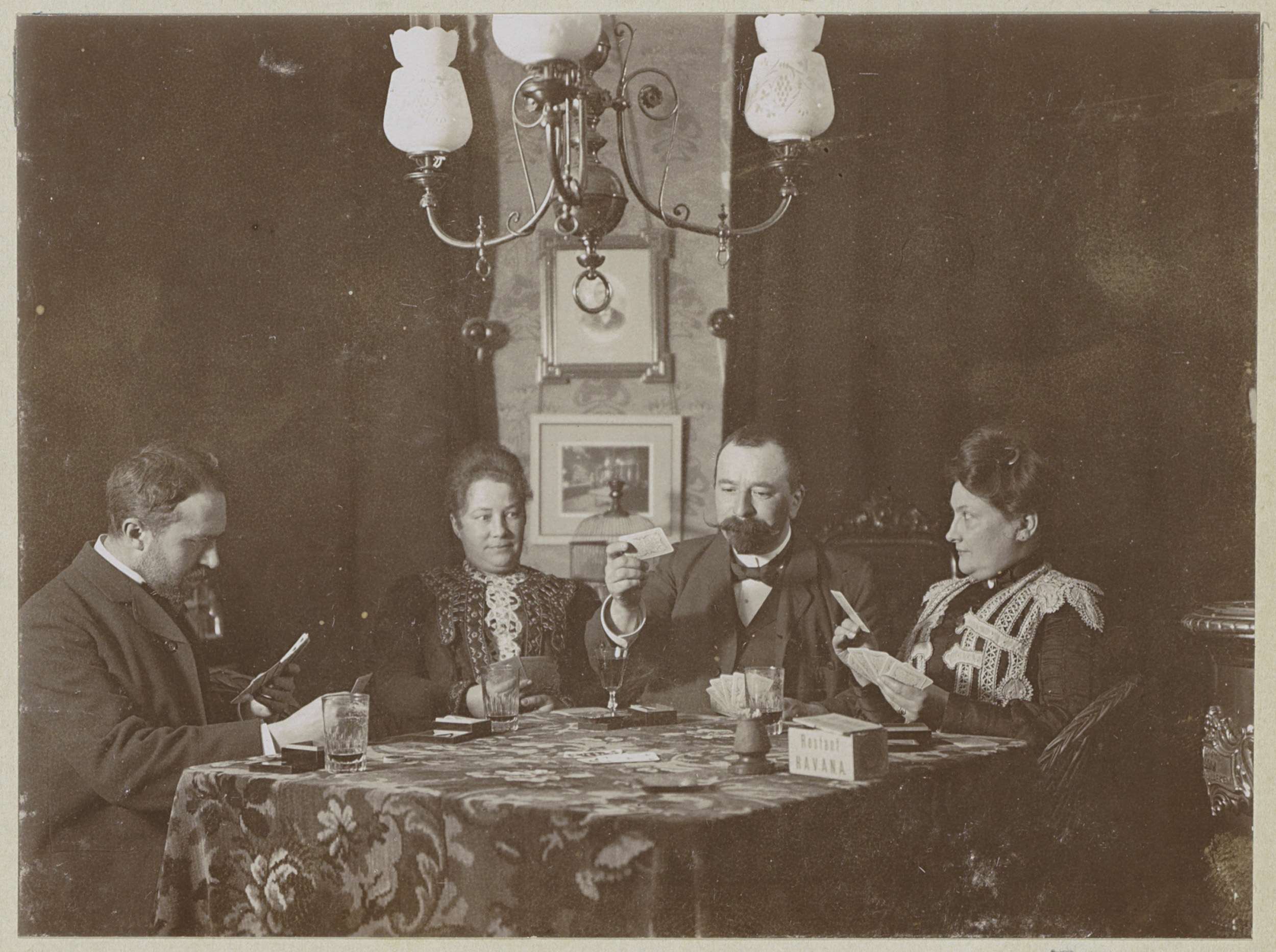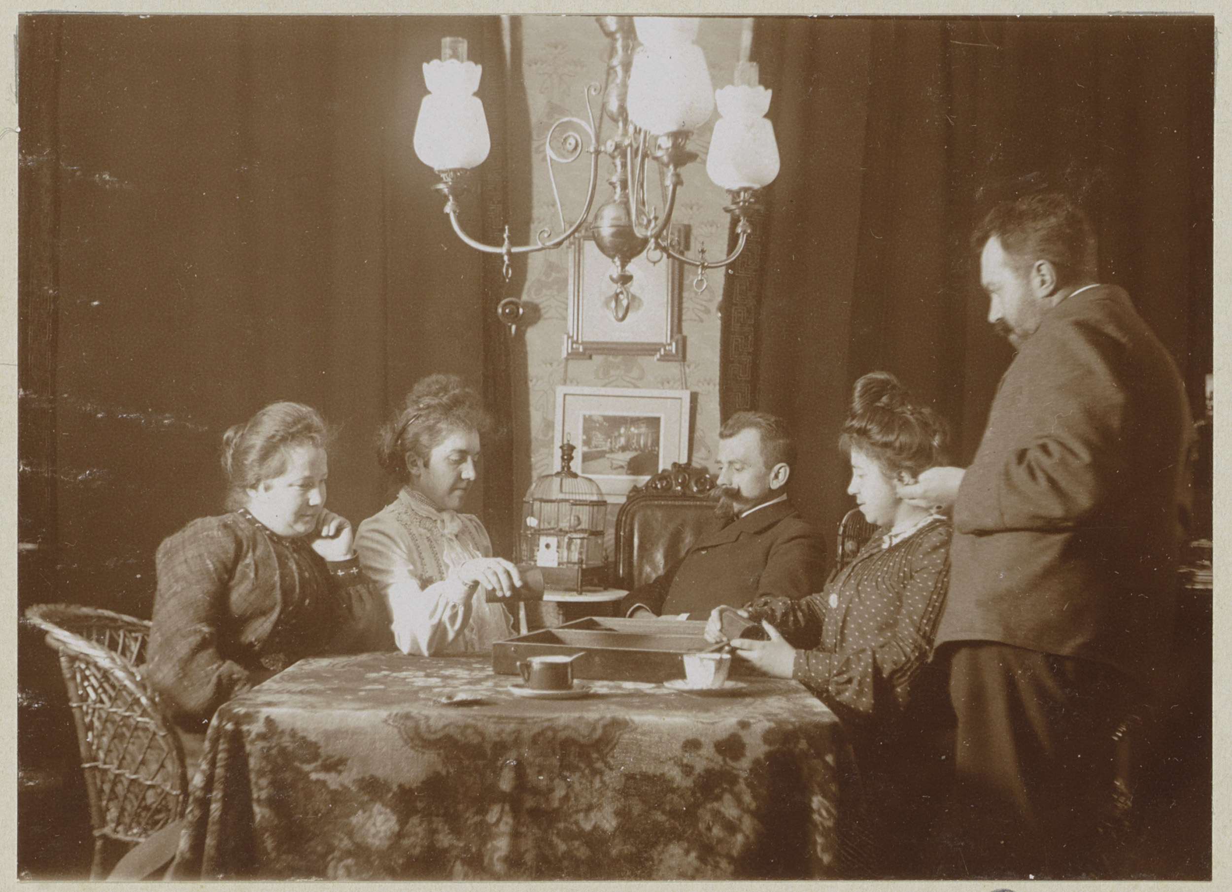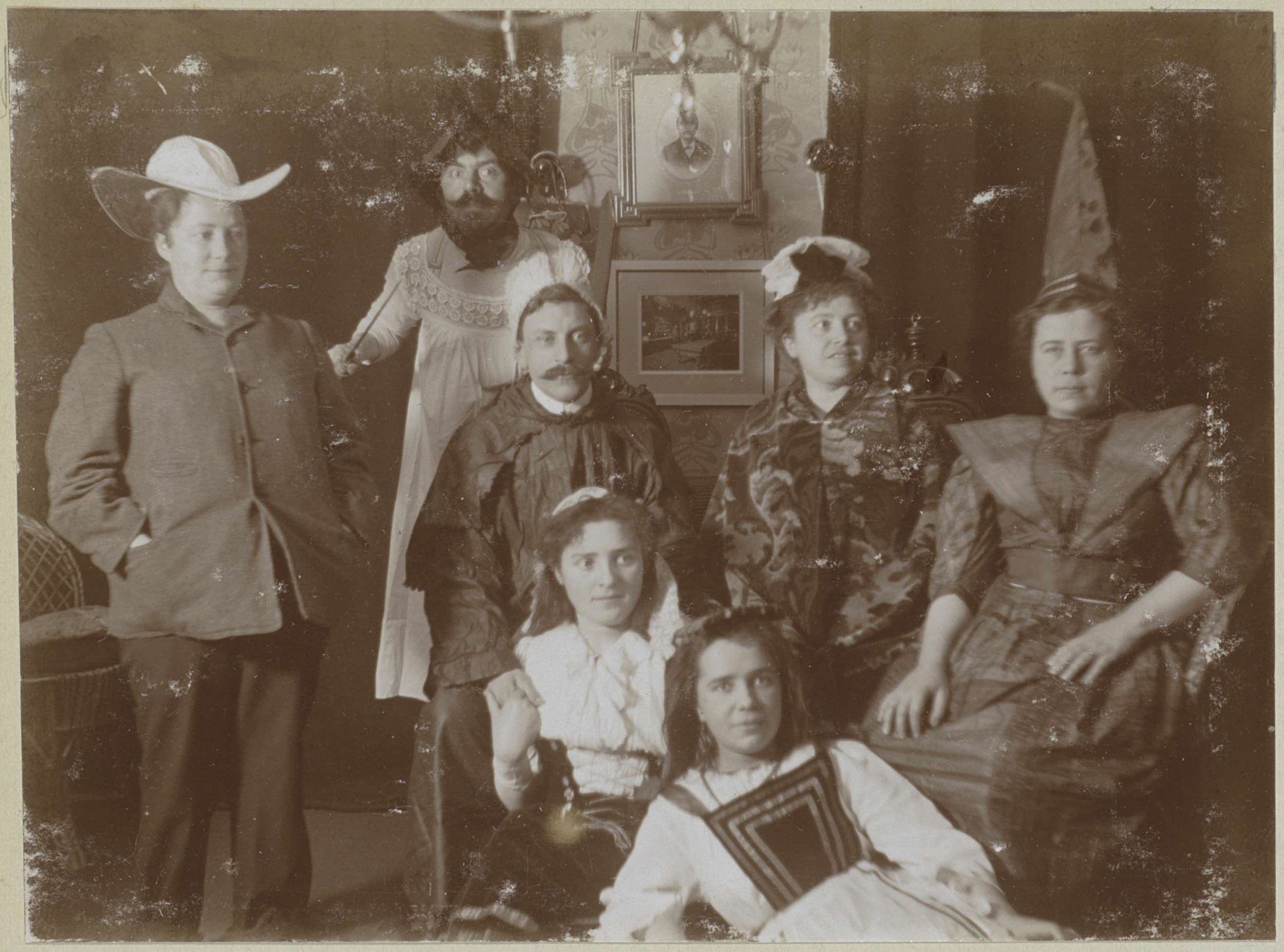 Mannen en vrouwen voor een huisje, vermoedelijk op e...