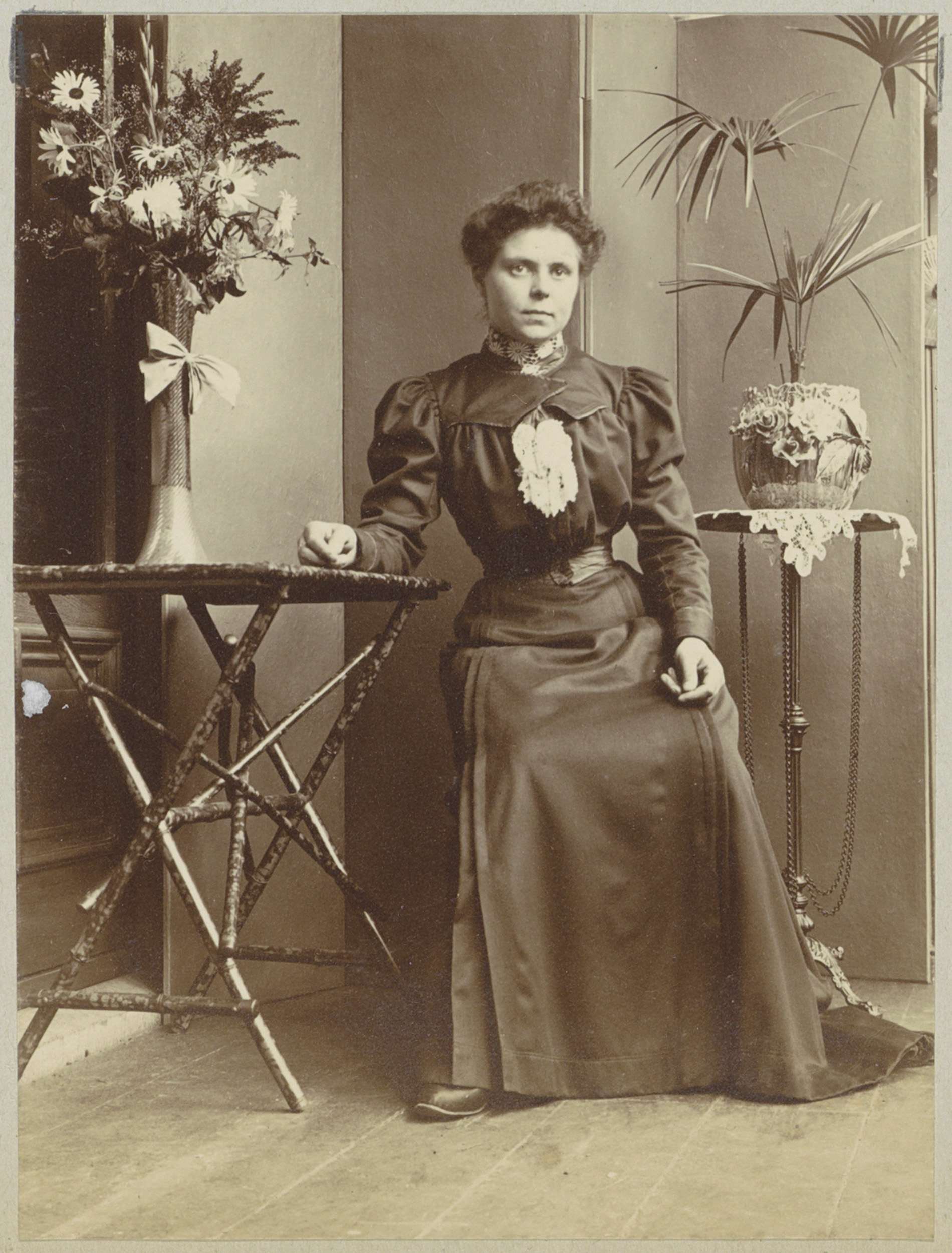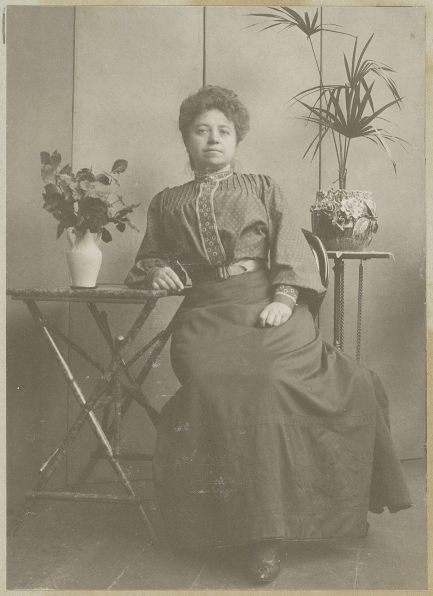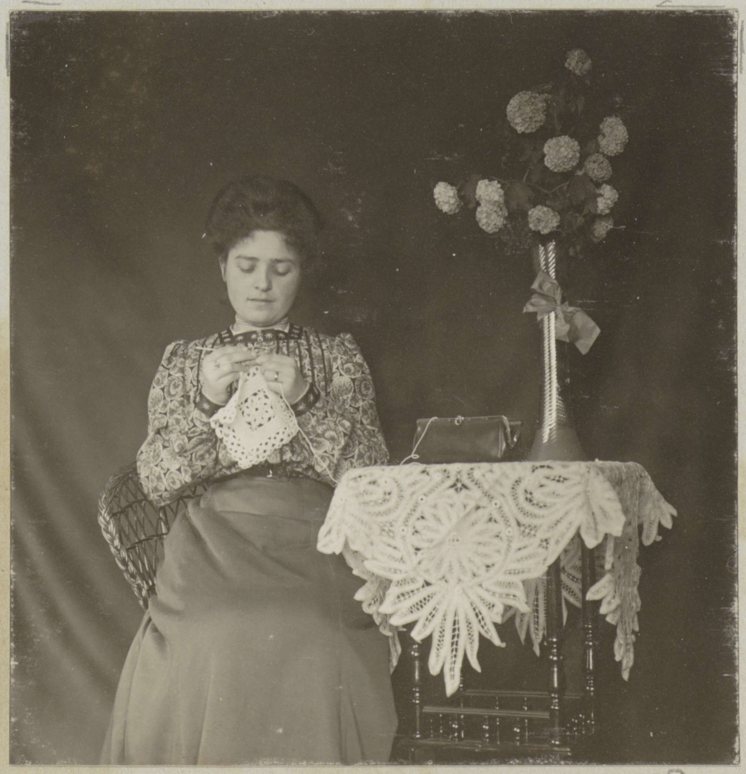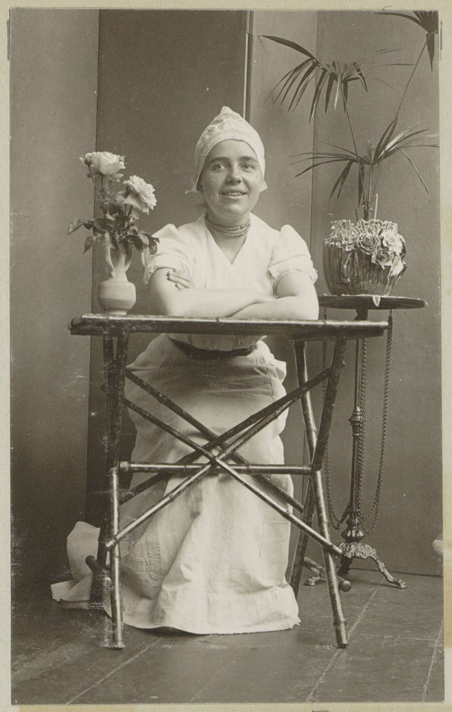 Vrouw met een dienstbodenkapje op, zittend aan een t...