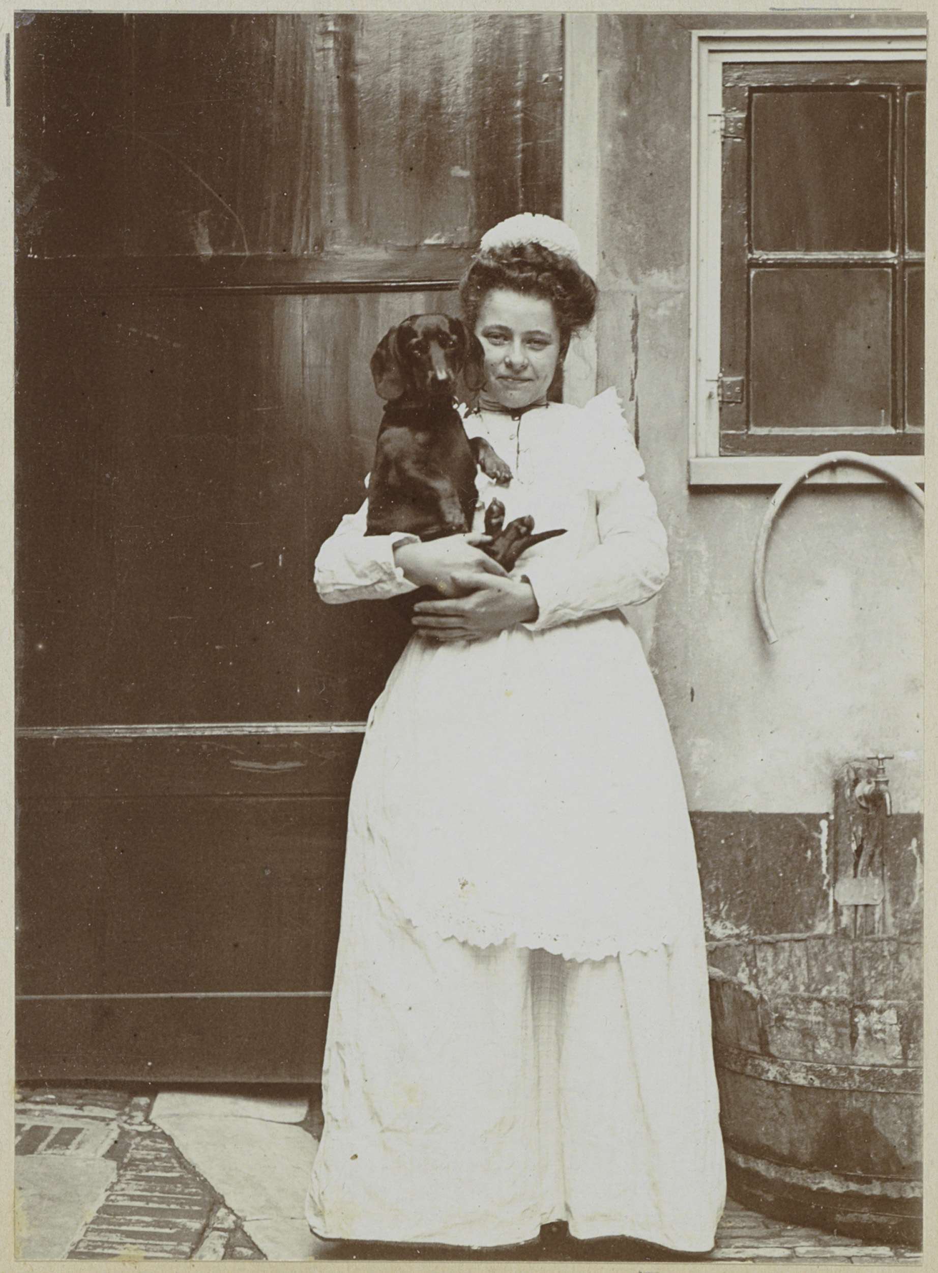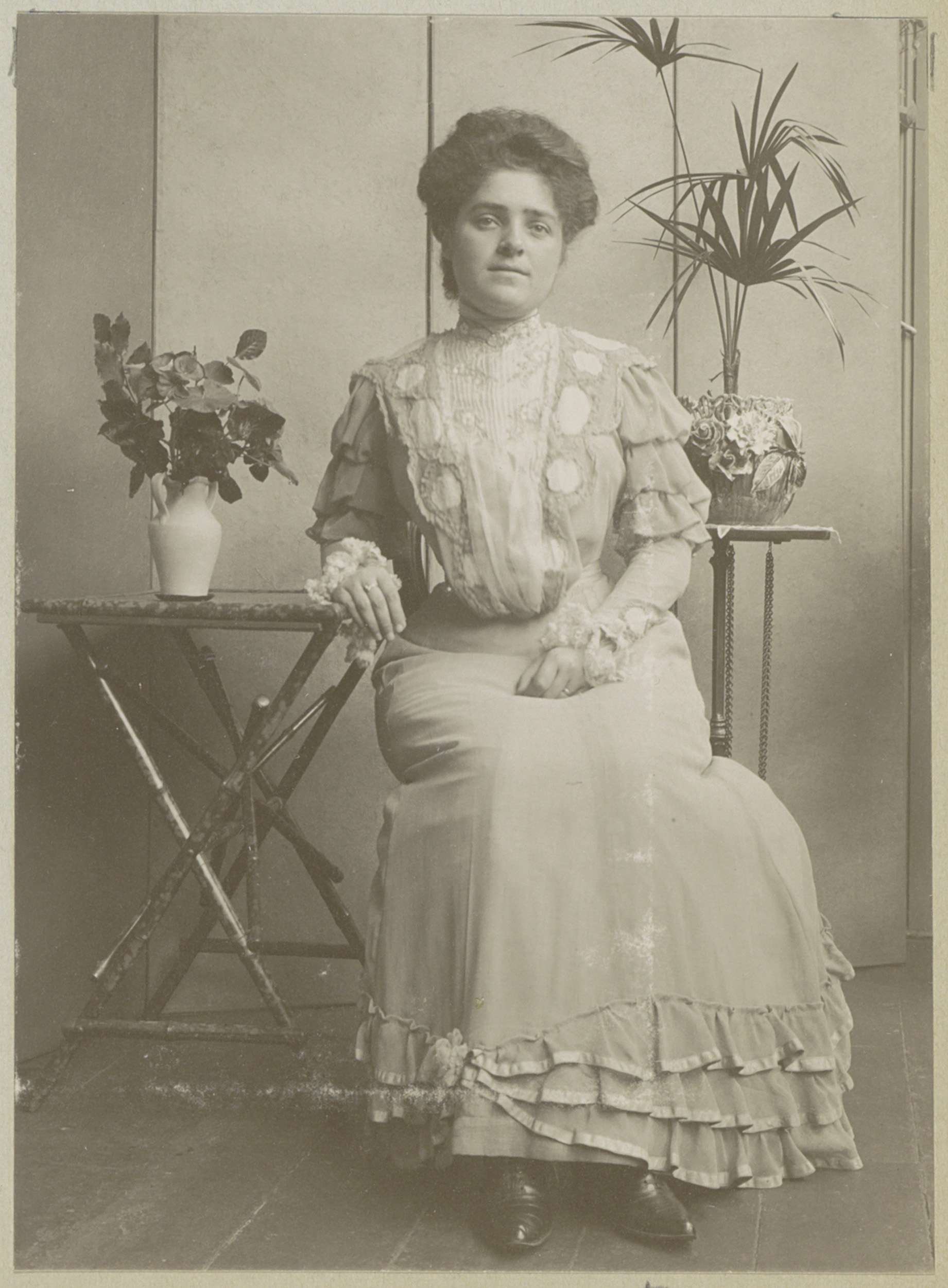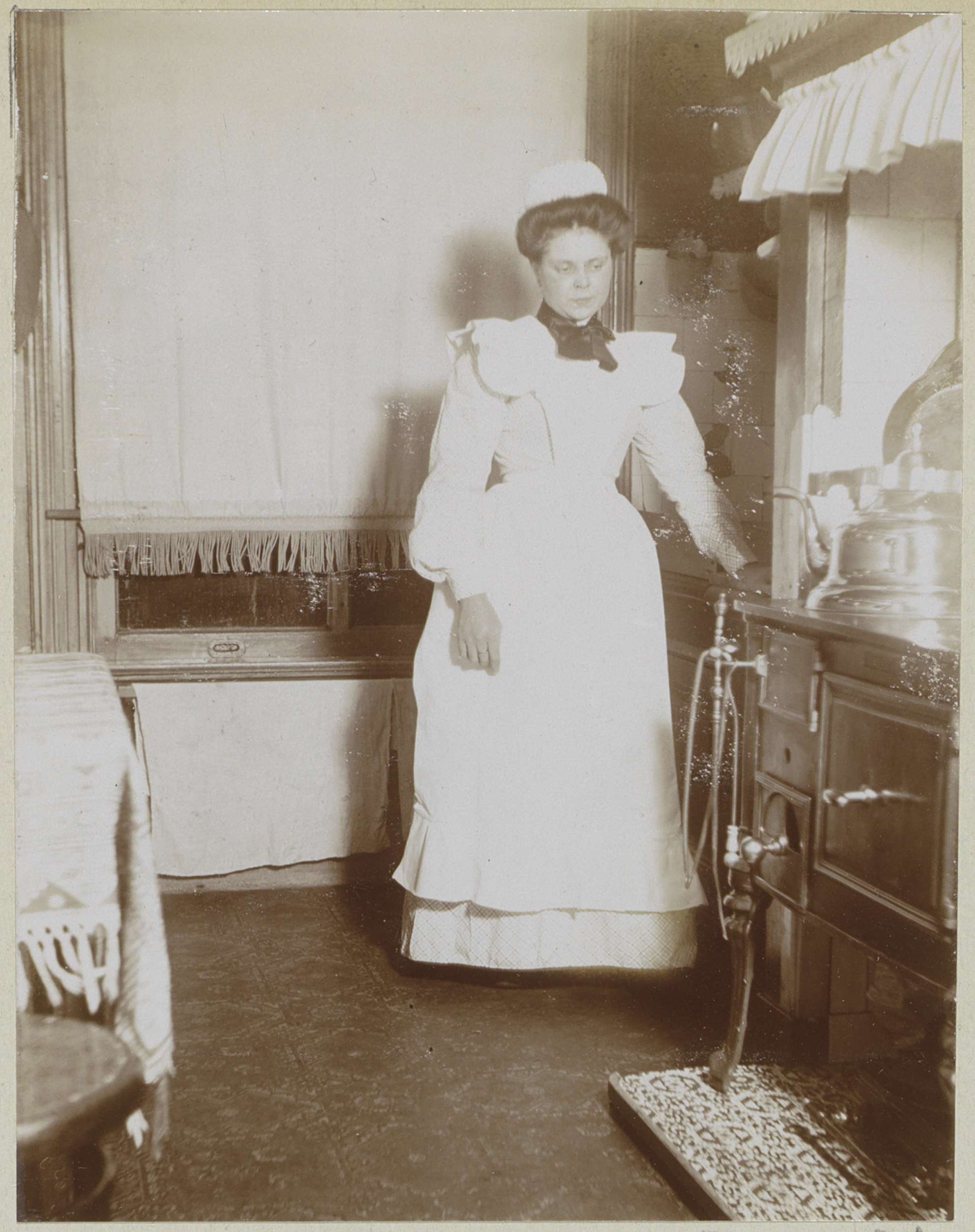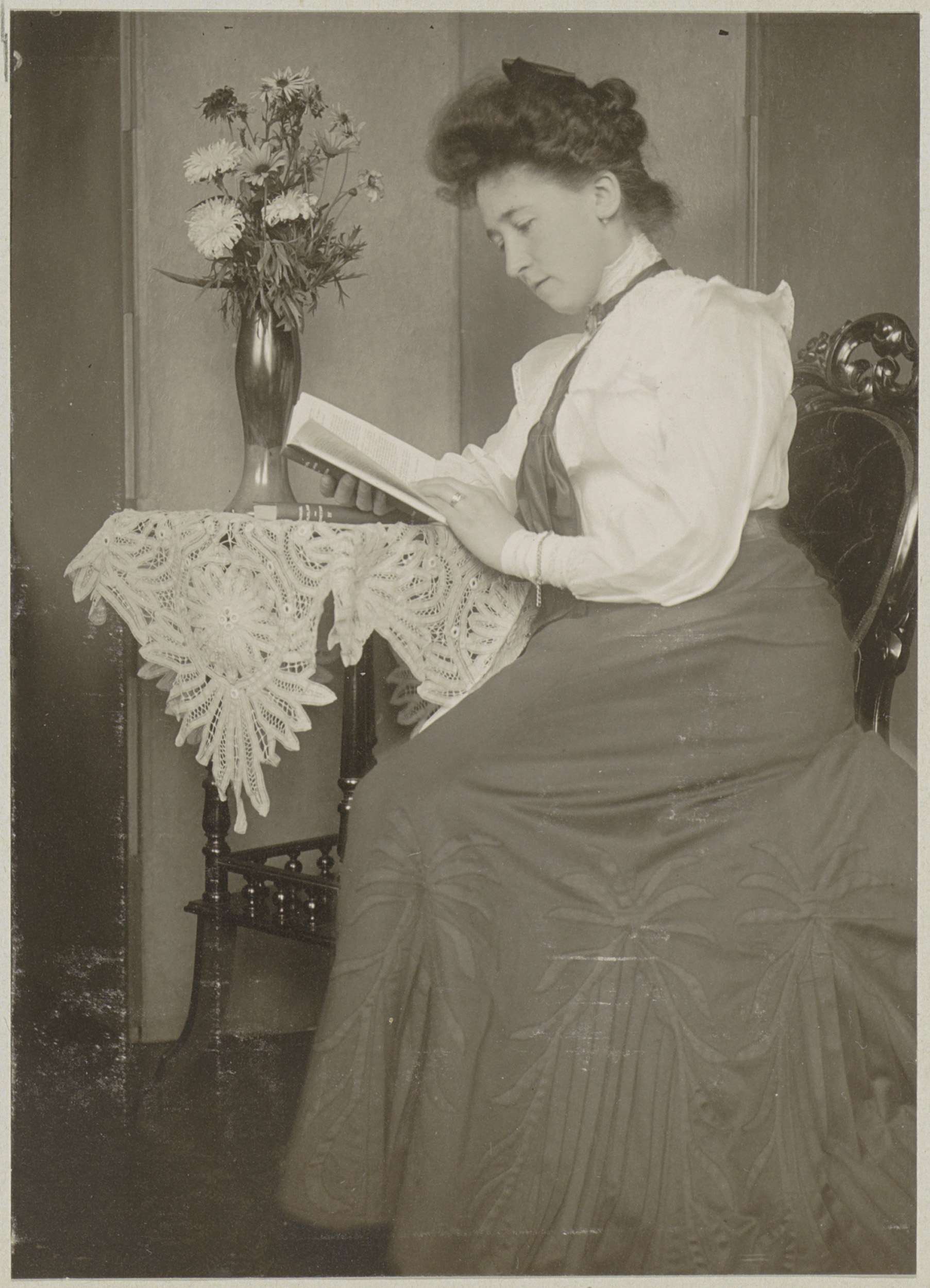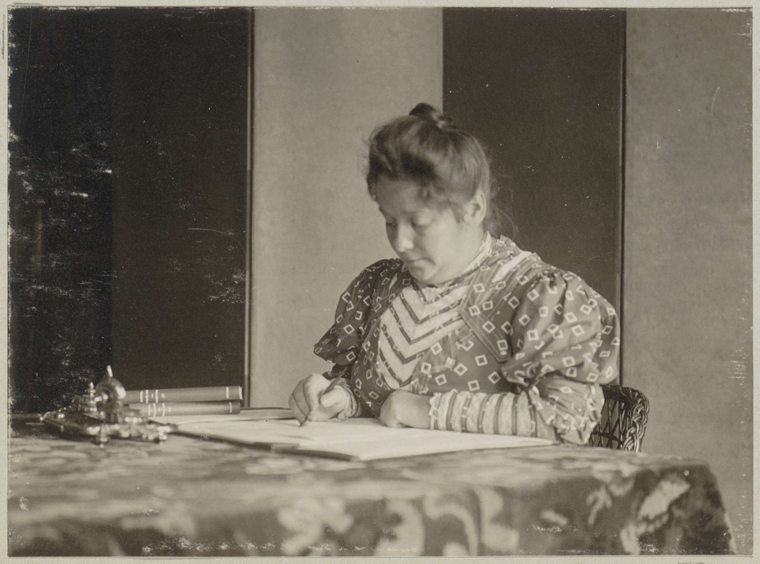 Vrouw met een dienstbodenkapje op, zittend aan een t...