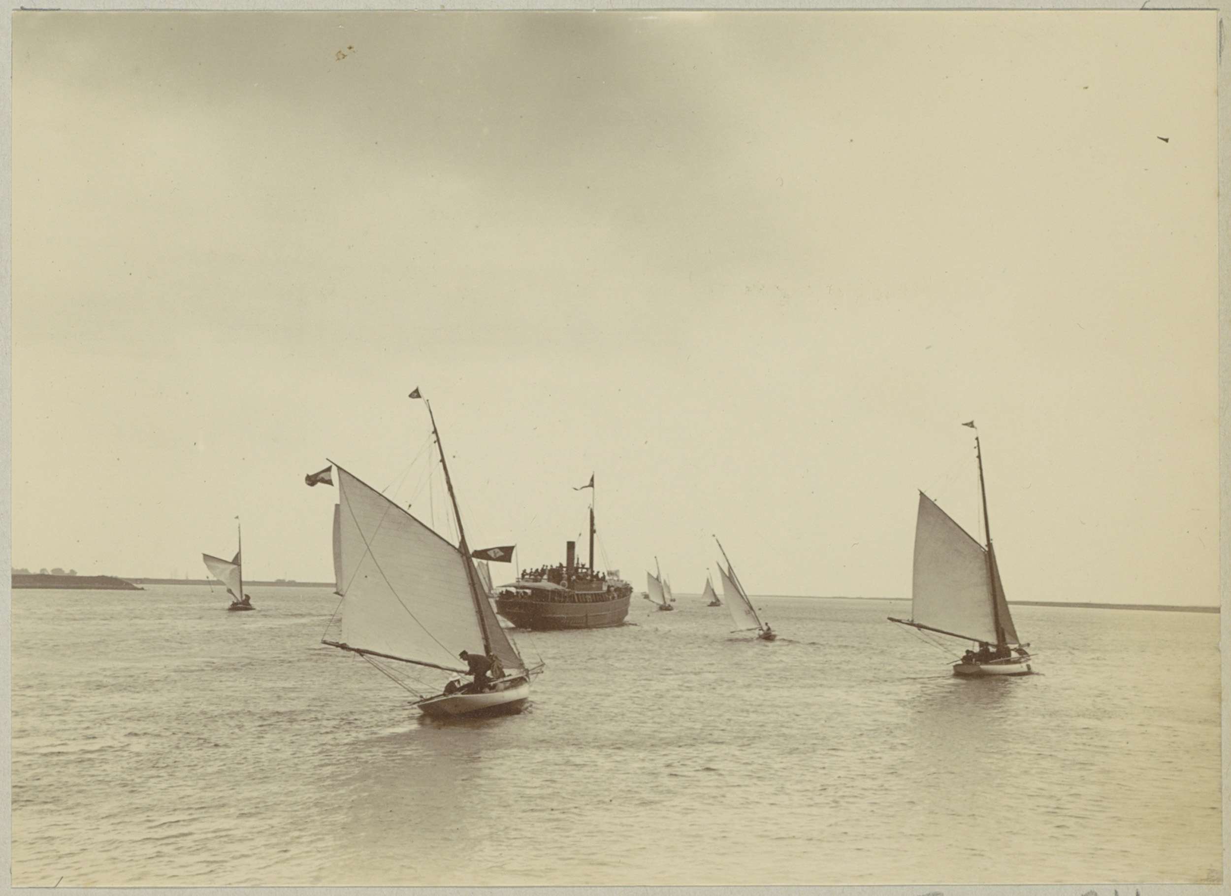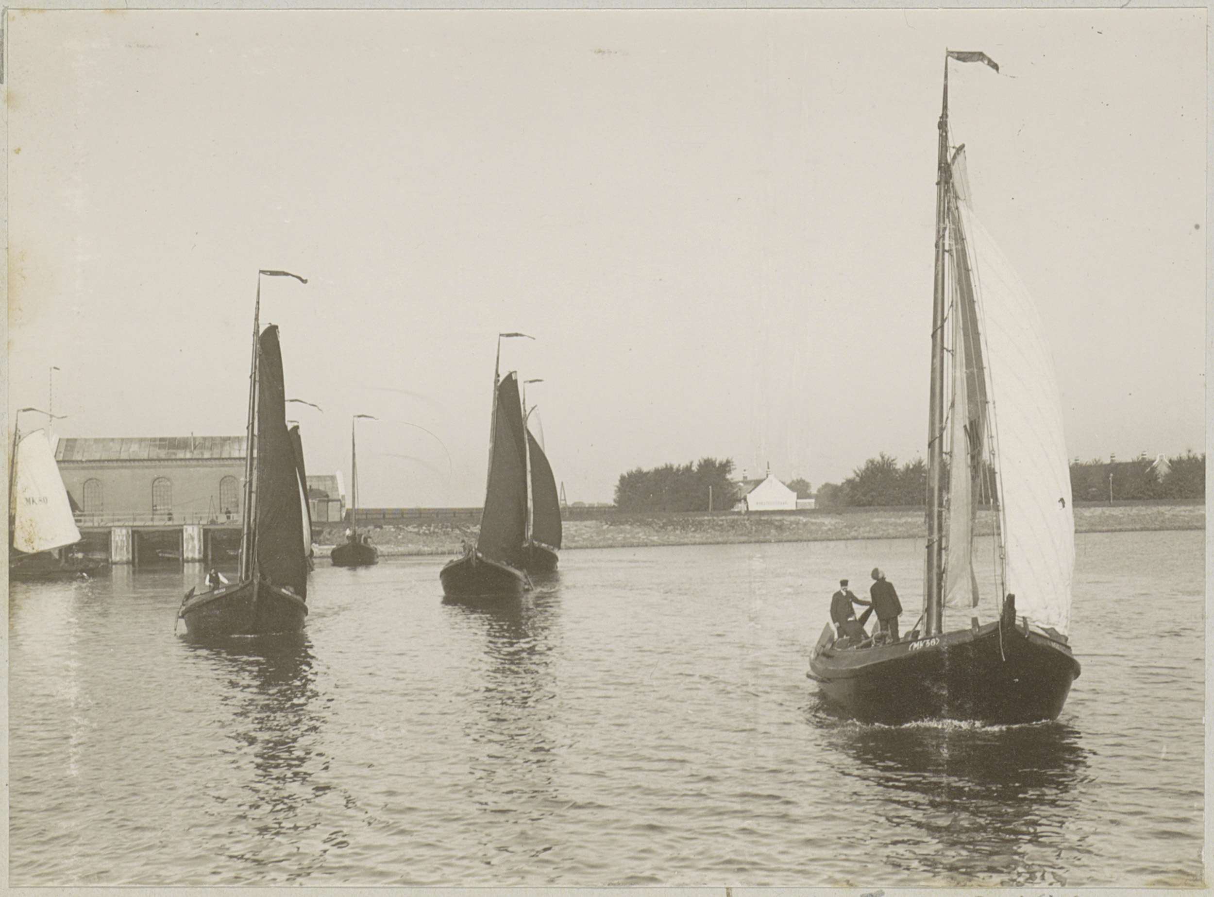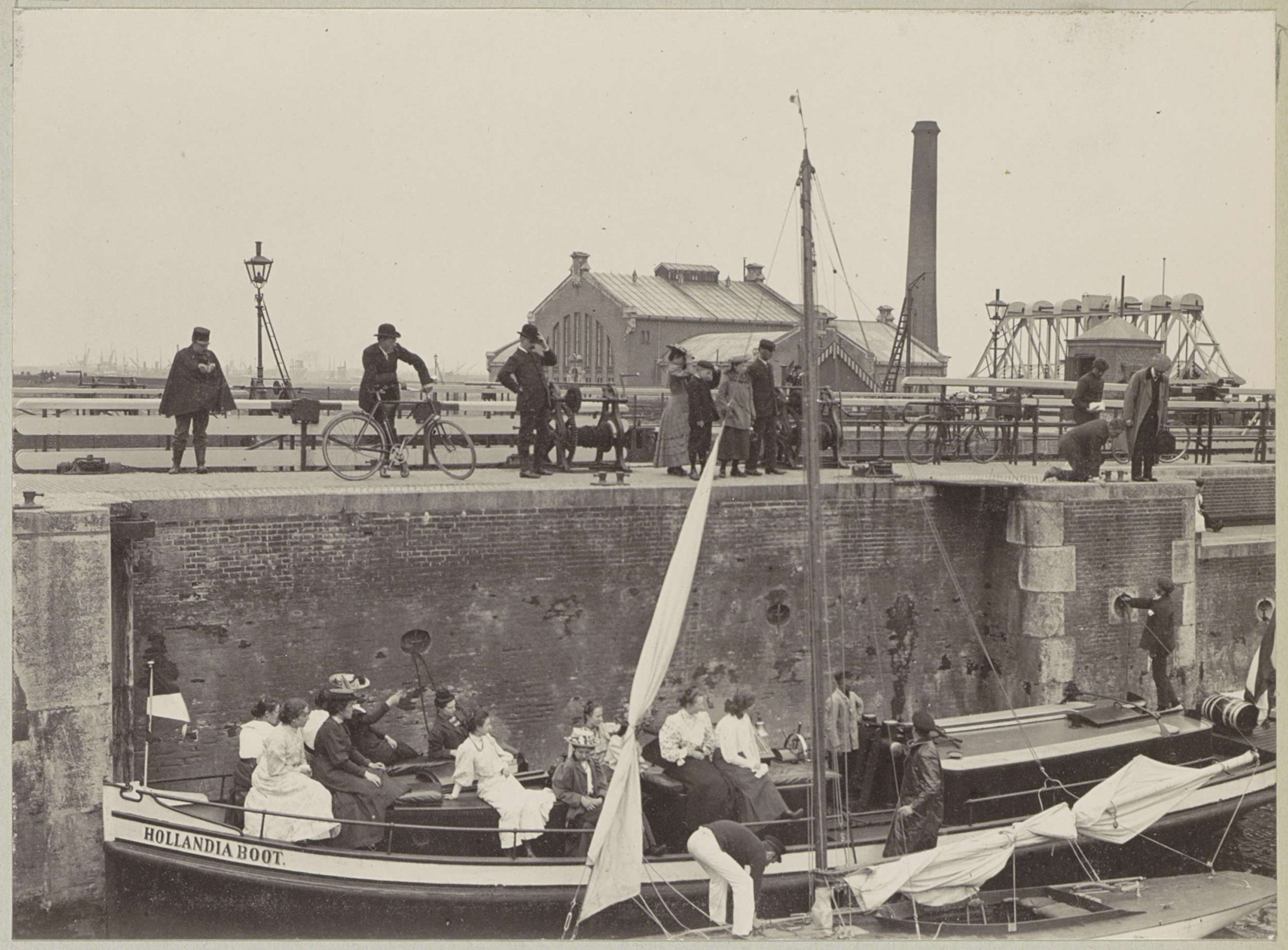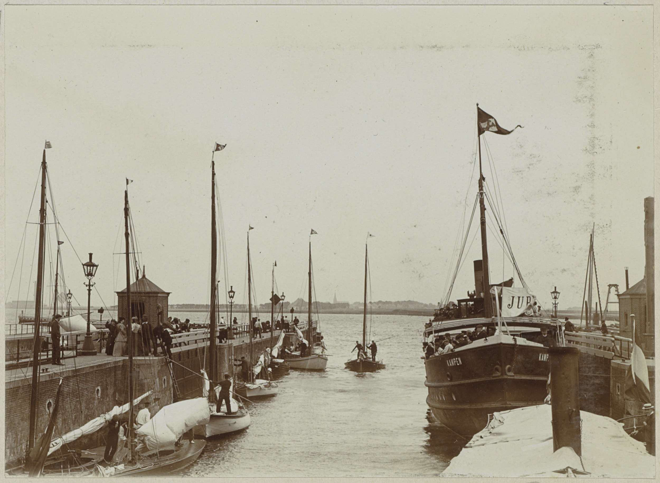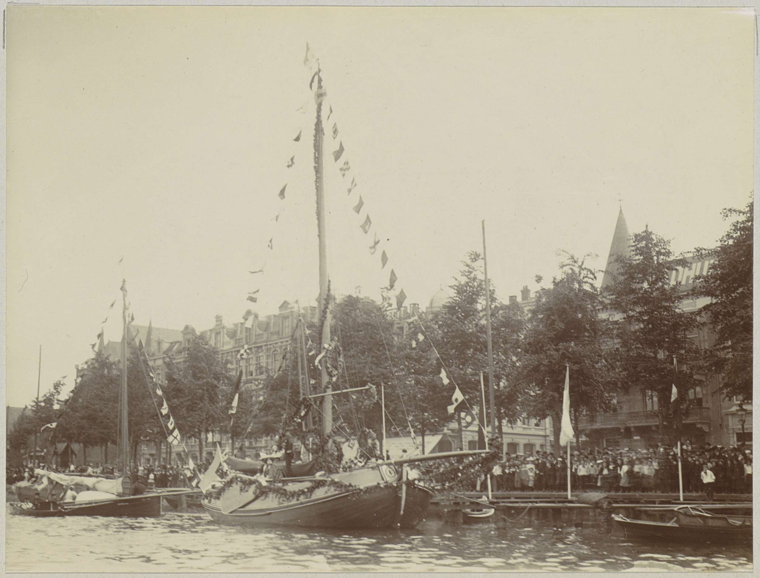 Toeschouwers bij versierde boten aan de Amsteldijk