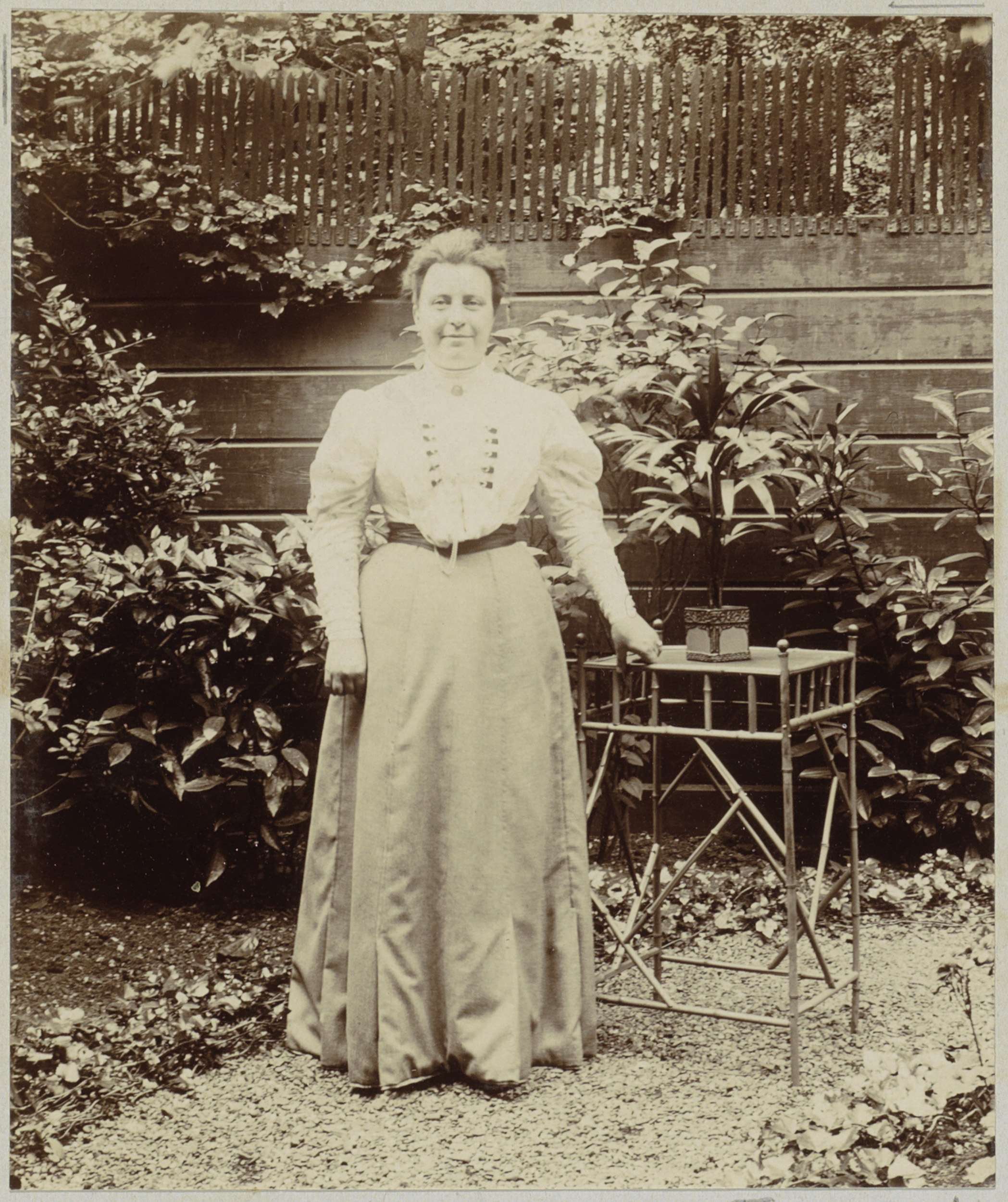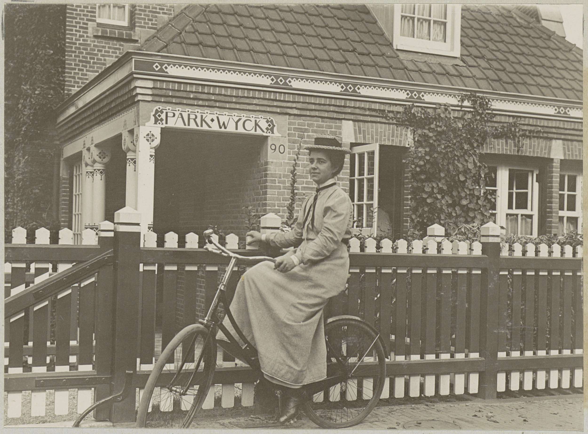 Vrouw zittend op een fiets, leunend op een tuinhek v...