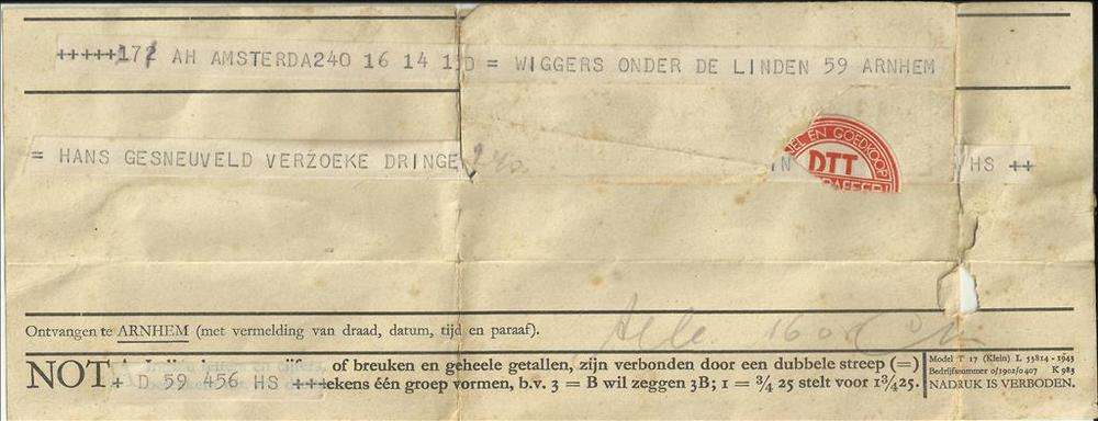 Telegram voor Wiggers, Onder de Linden 59 te Arnhem