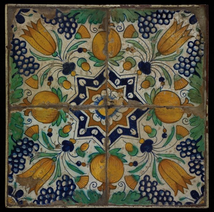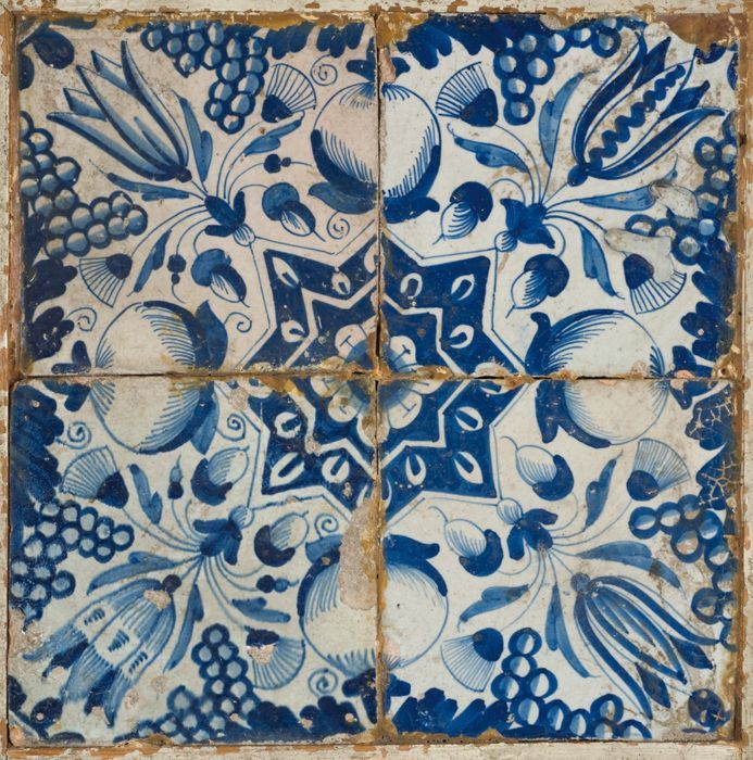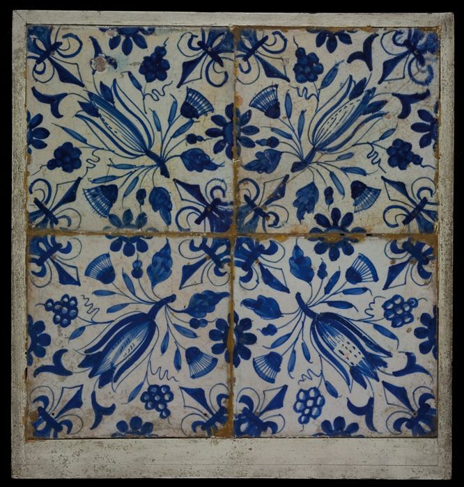 Tegelveld, blauw op wit, vier ornamenttegels, tulp e...