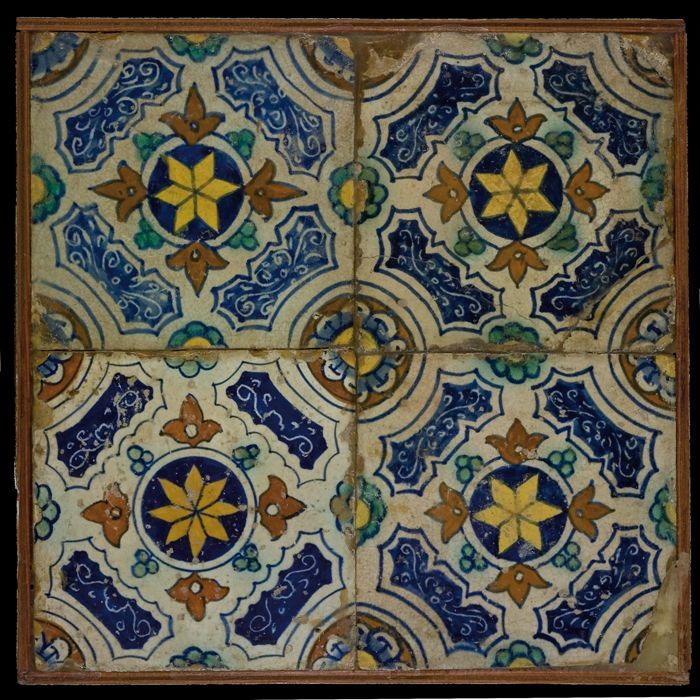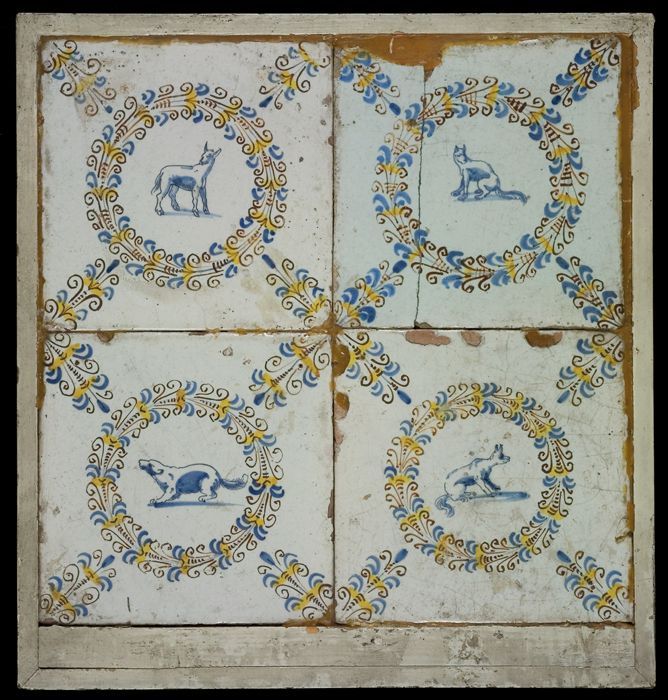 Tegelveld, blauw op wit, vier ornamenttegels, stertu...