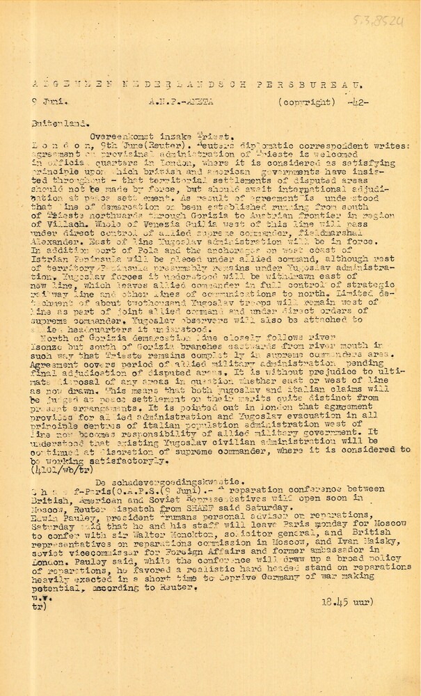 Algemeen Nederlandsch Persbureau, mededelingen, 24 m...