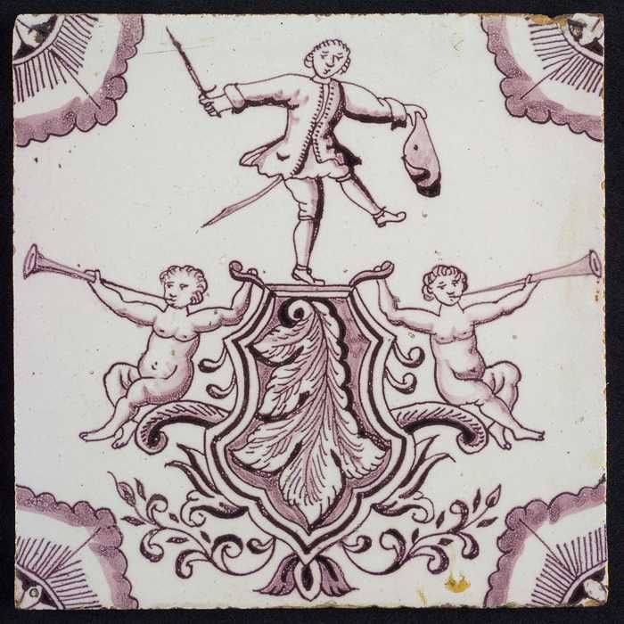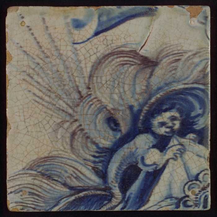 Tegel met in paars en blauw windgod en wolken