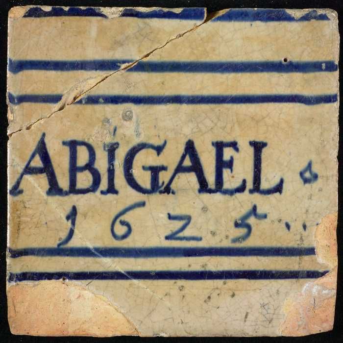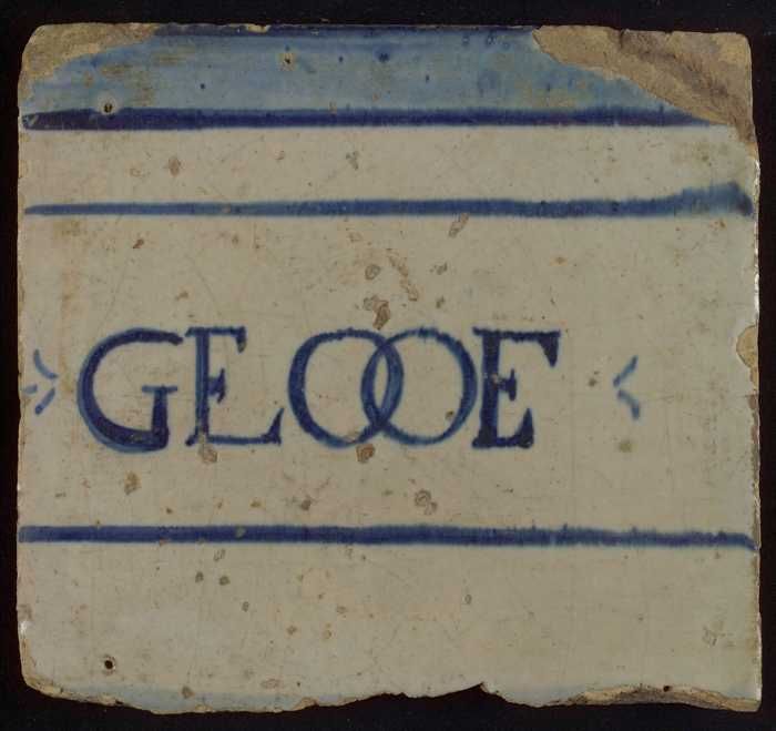 Witte tegel met in blauw horizontale lijnen en "Geloof"