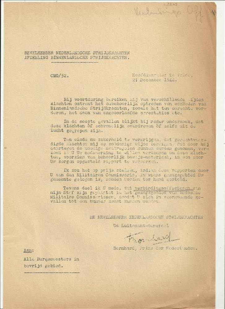 BNS van Houten aan de Burgemeesters, 21 december 1944