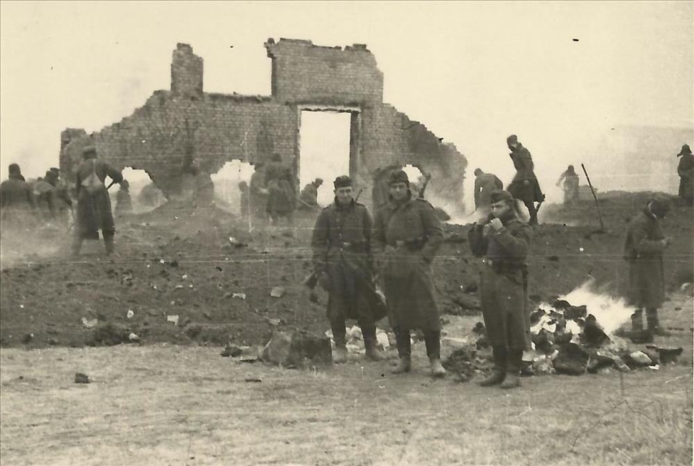 Duitse militairen, vernield gebouw