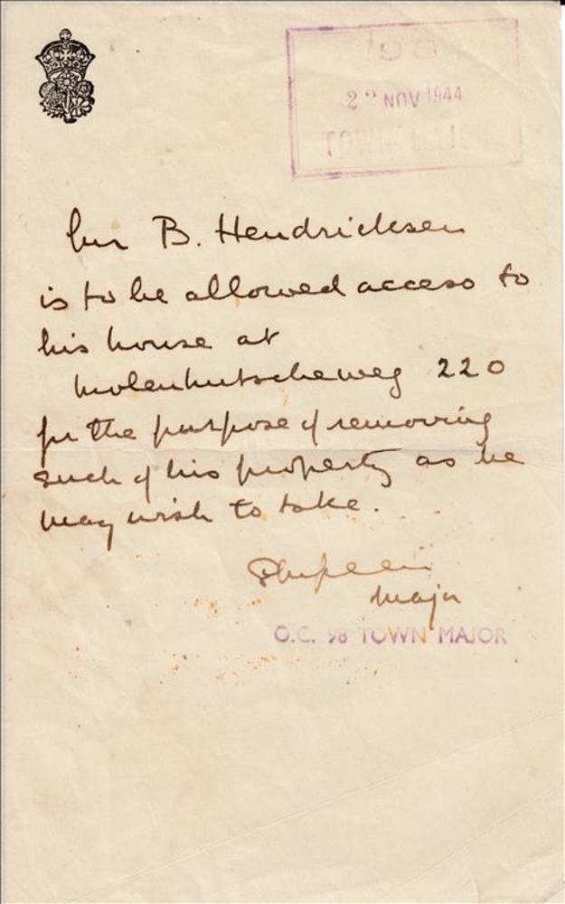 hand geschreven toegangspas voor B. Hendriksen