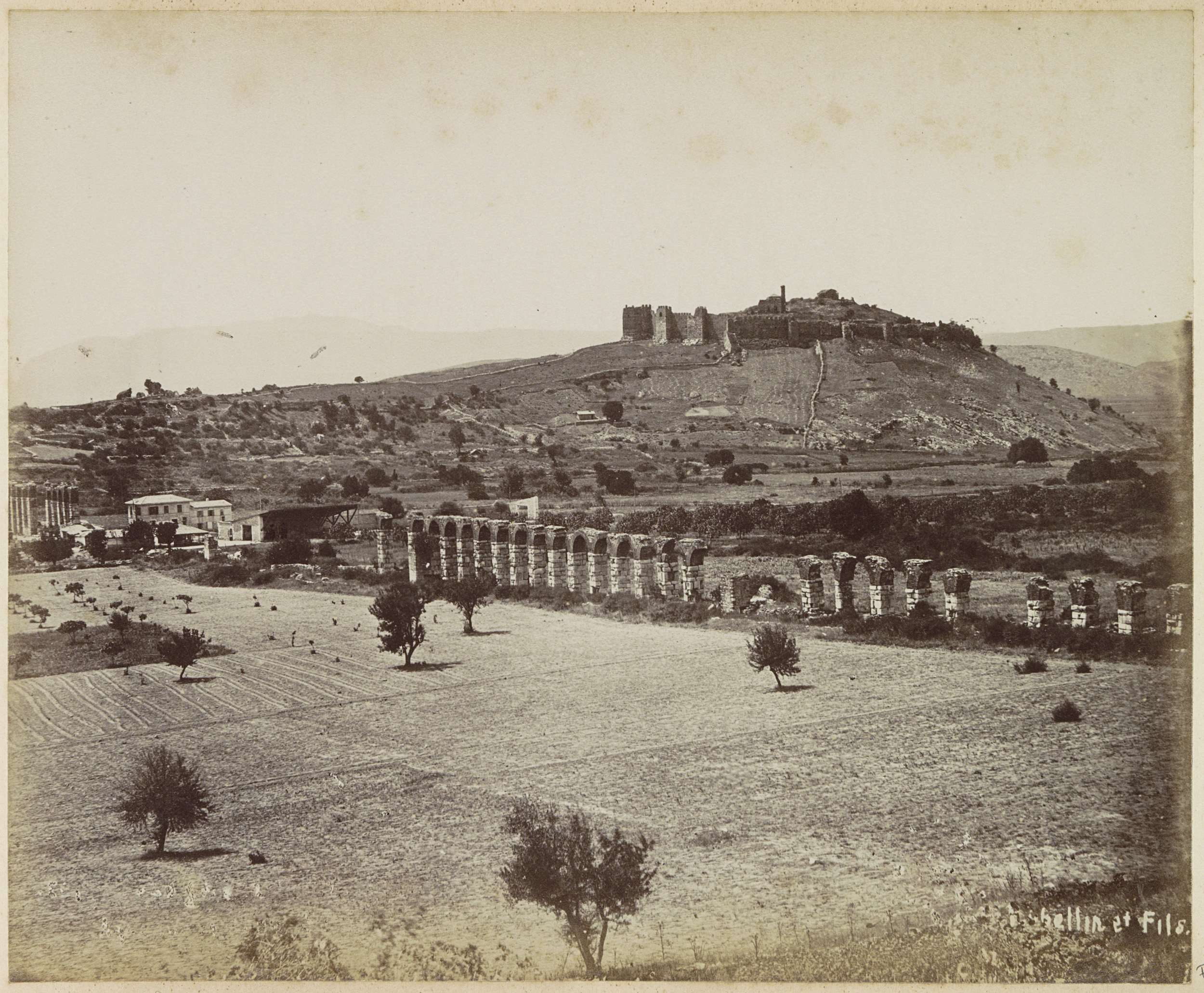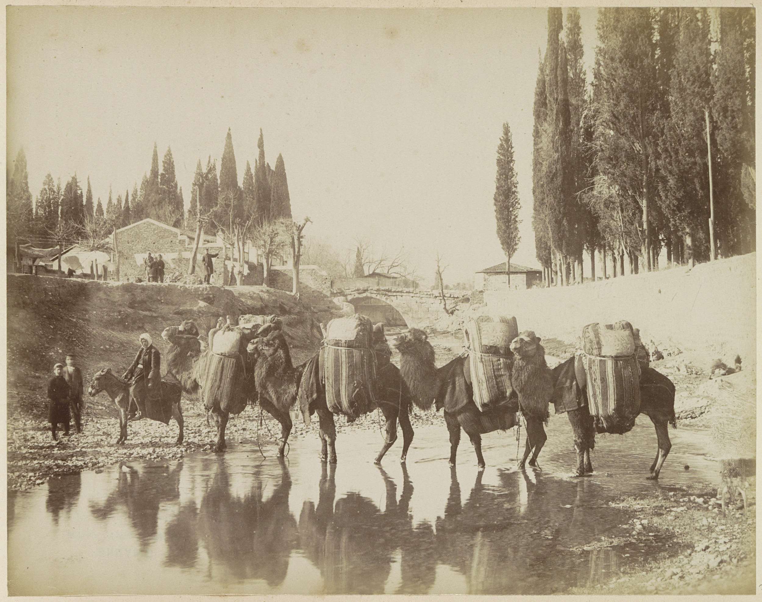Beladen lastdieren steken rivier over, vermoedelijk ...