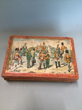 Kartonnen bonbondoos waarin 23 tinnen ruiters (Ulane...