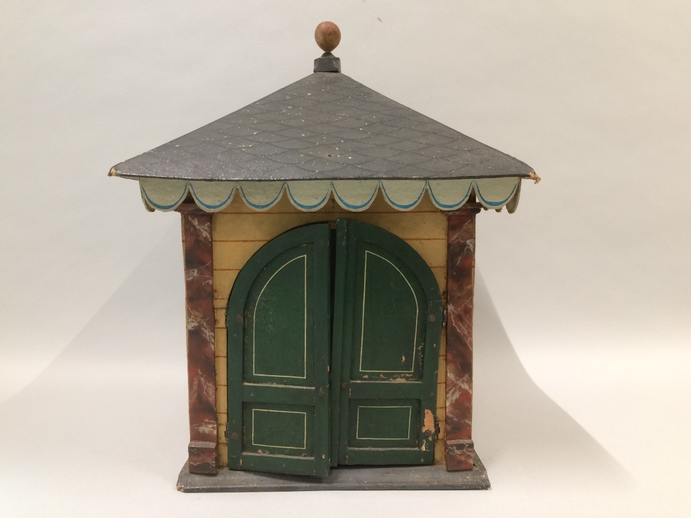Poppentoneel met drie toneeldecors in kartonnen doos...