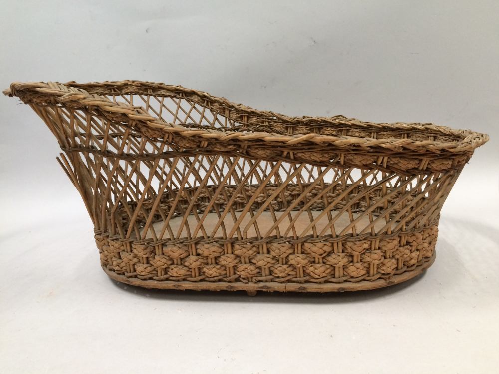 Poppenwieg van gevlochten teen met houten bodem, de ...