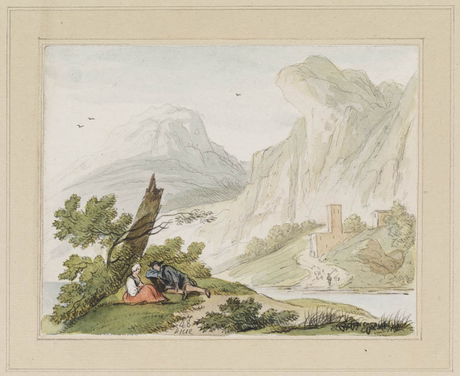 Bergachtig landschap met rustende man en vrouw
