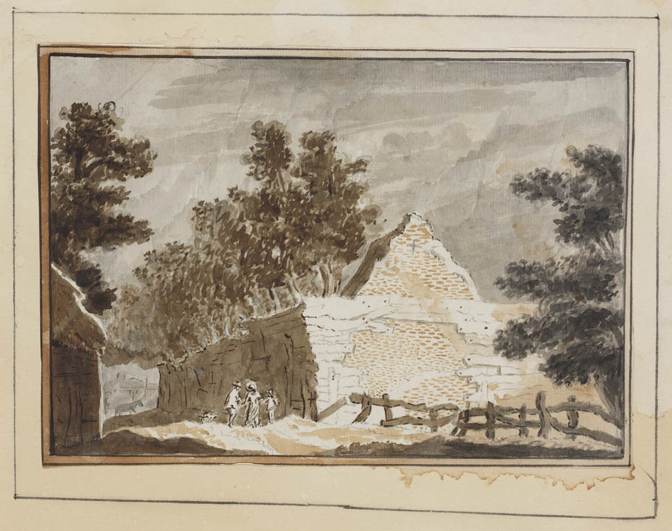 Figuren bij een bouwvallige schuur