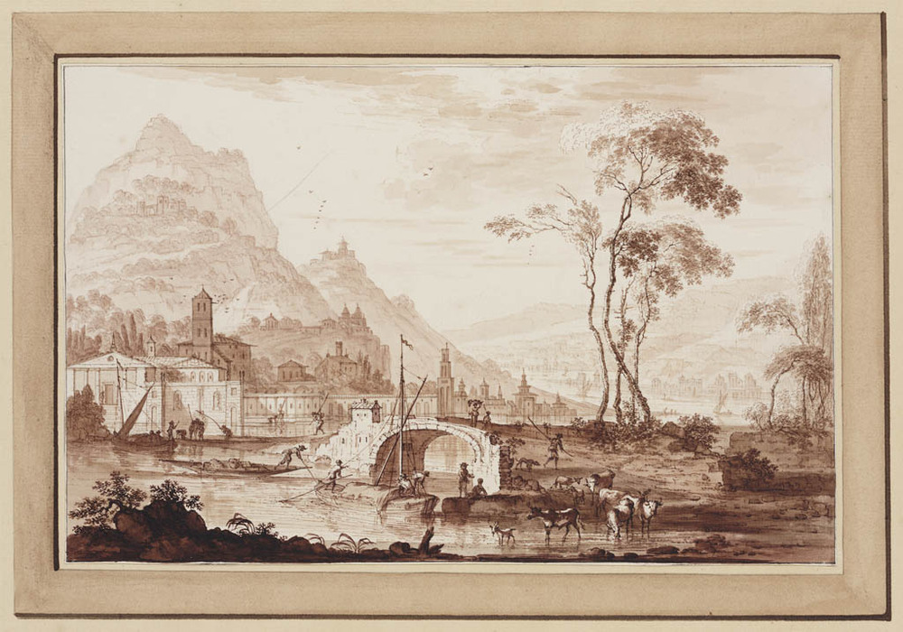 Italiaans landschap met stad aan de rivier