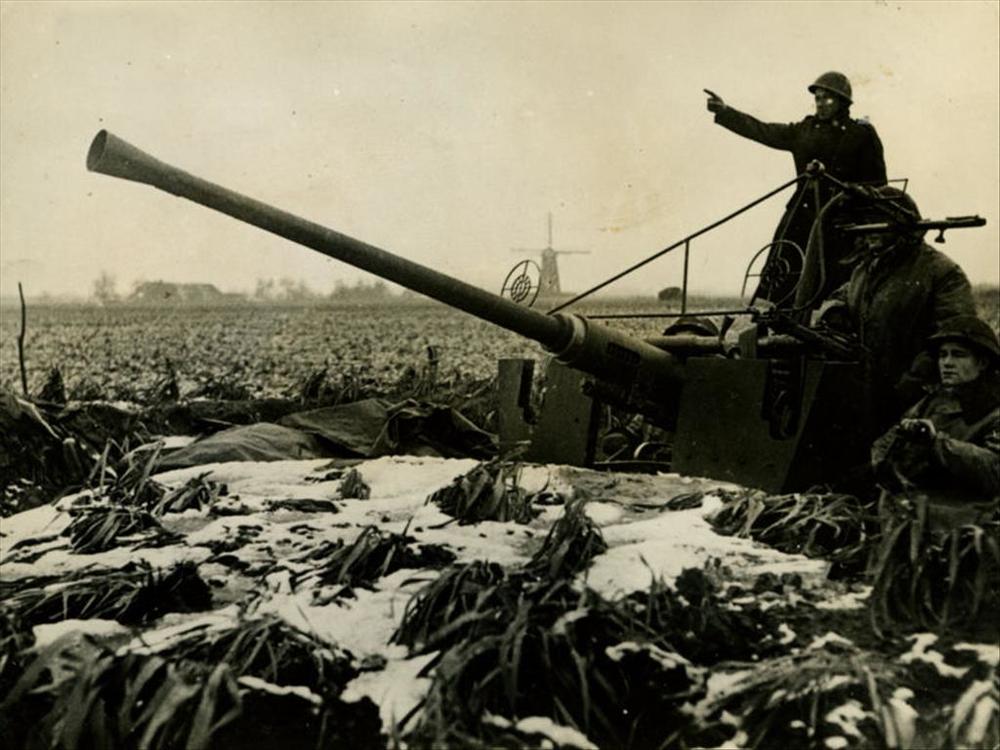 Britse militairen bij 40mm Bofors kanon met molen op...