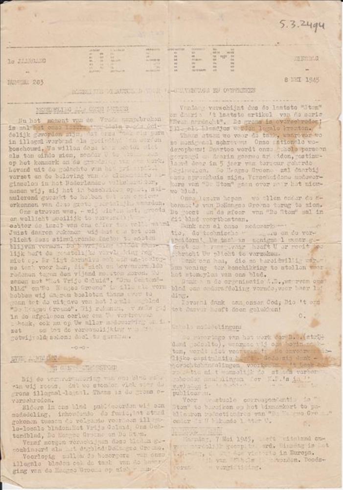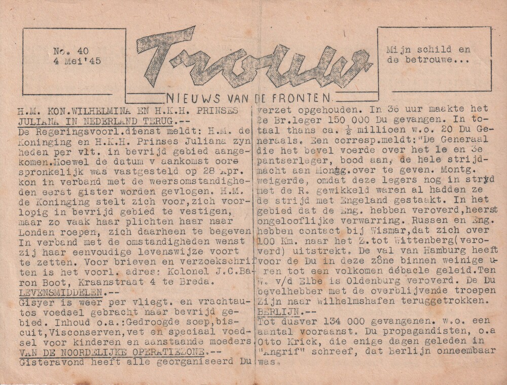 Dagelijksche nieuwsuitgave "Trouw" 4 mei 1945