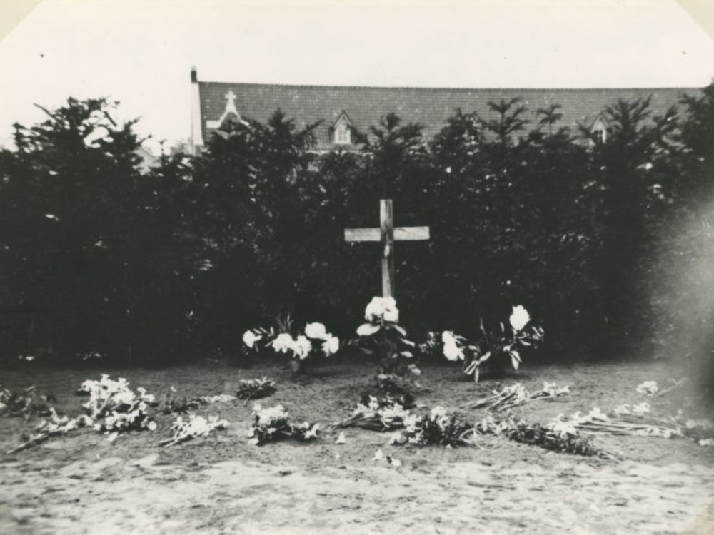 Foto van collectief graf met bloemenversiering. Teks...