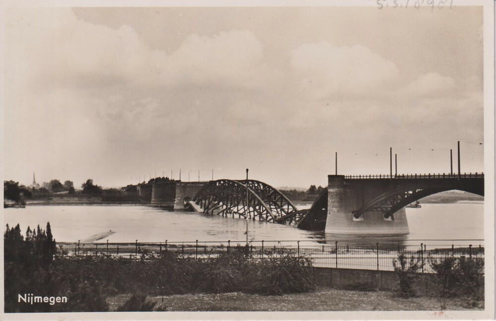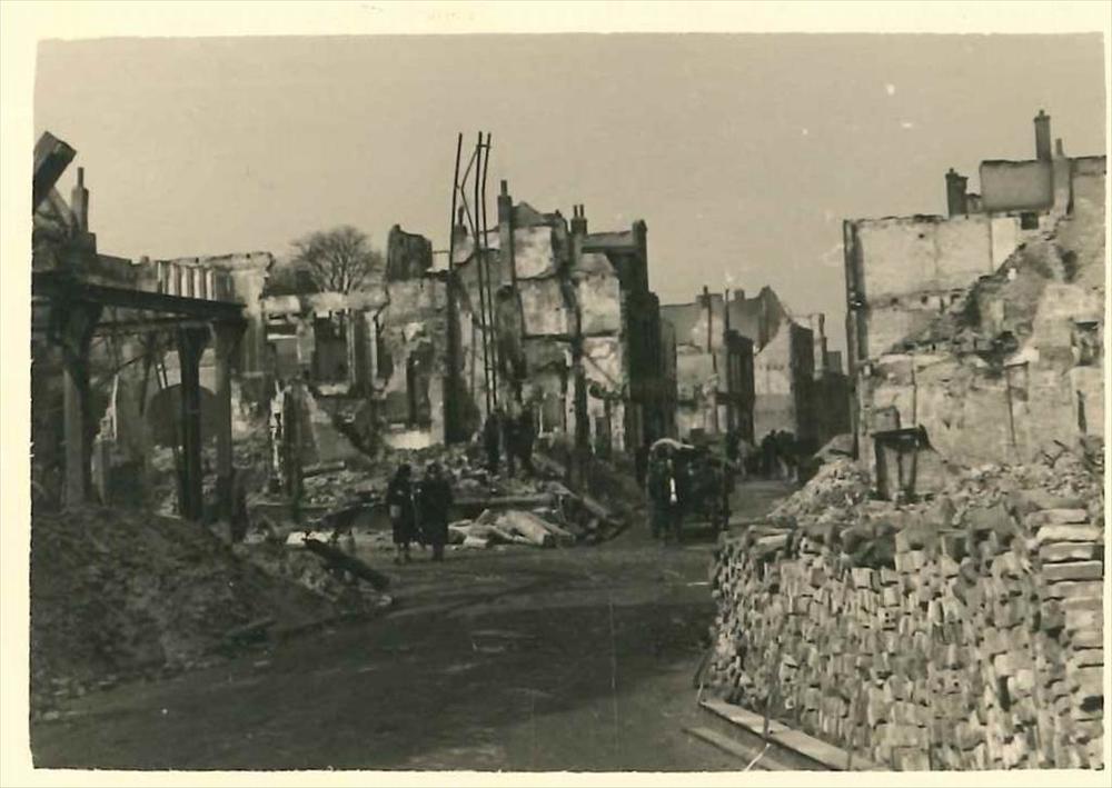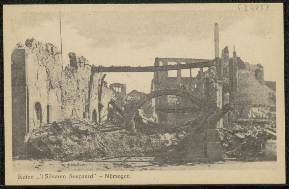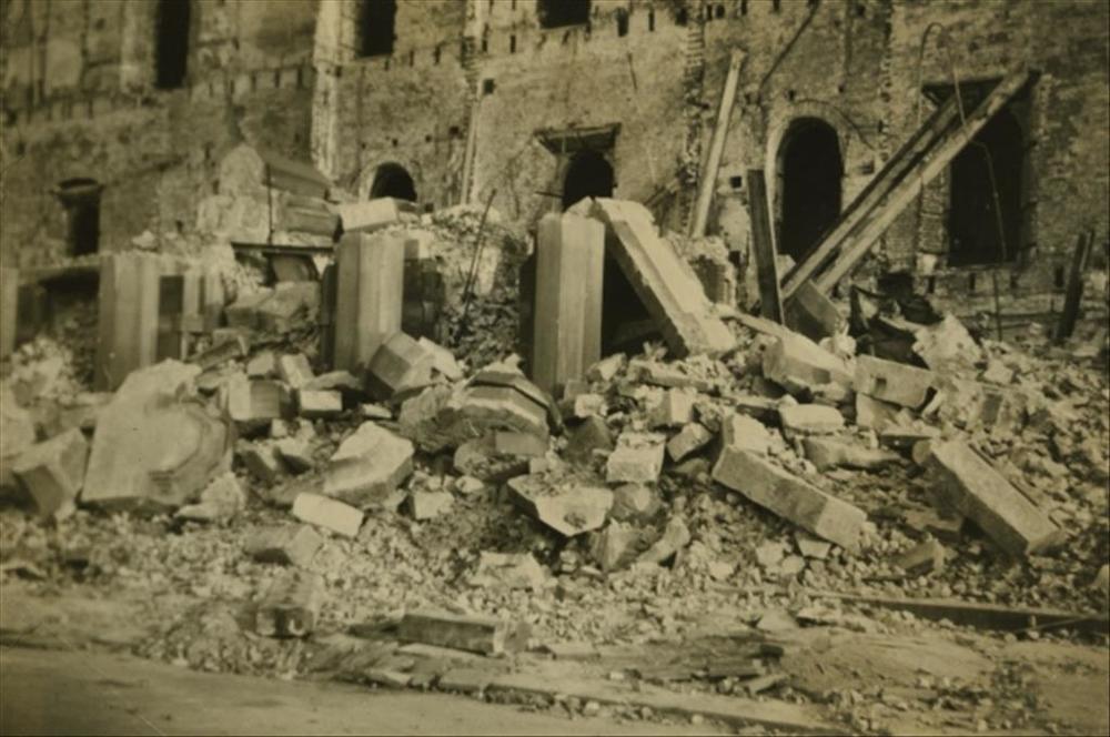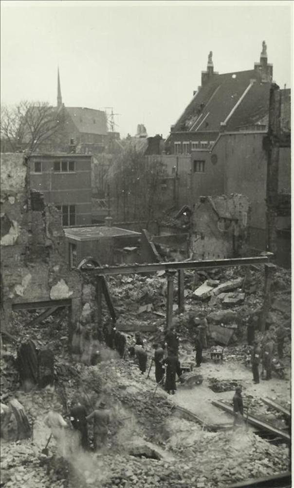 bombardement Nijmegen; puinruimen, kerk op achtergrond