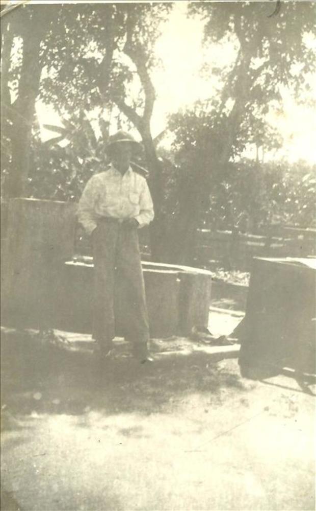 Indië; man met tropenhelm
