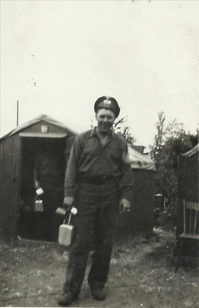Canadese militair met messtin in hand en Duitse pet ...