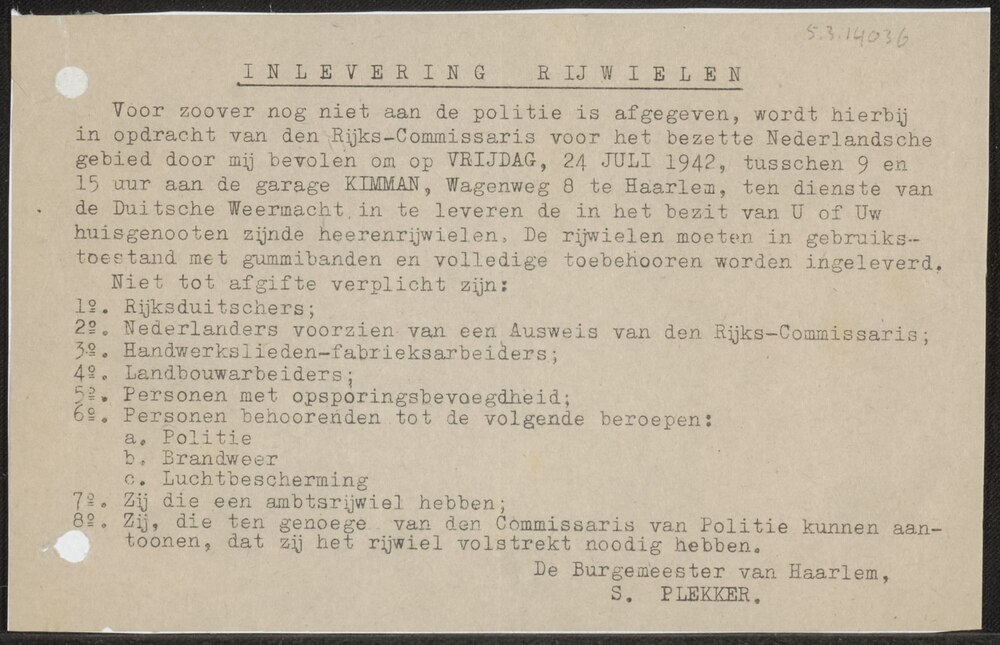 Oproep inlevering rijwielen te Haarlem op 24 juli 19...