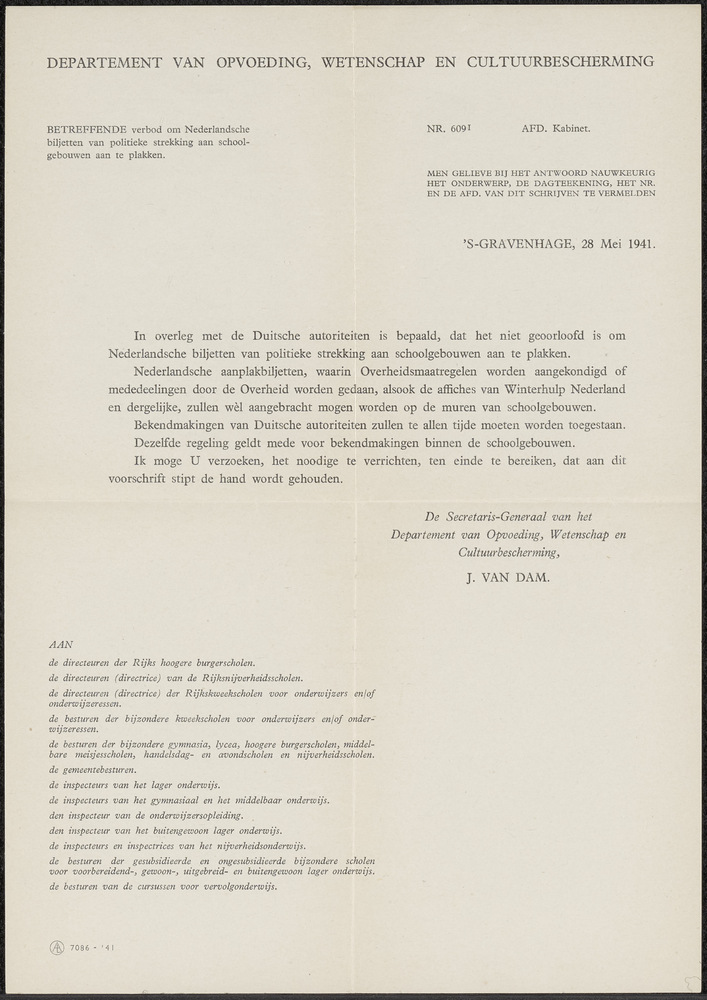 Brief van het Departement van Opvoeding, Wetenschap ...