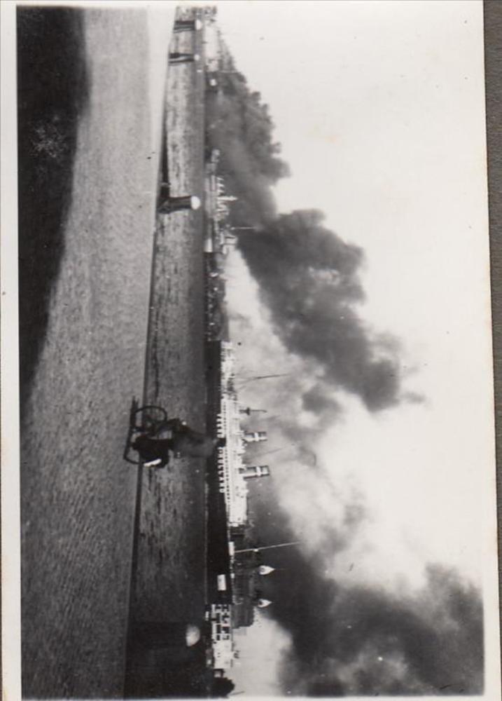 Foto van de afgemeerde S.S. Statendam onder de rook ...
