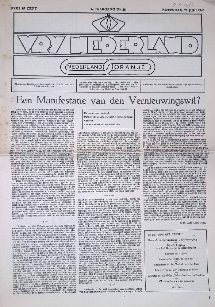 Vry Nederland, 5e jaargang nr 28, 23 juni 1945