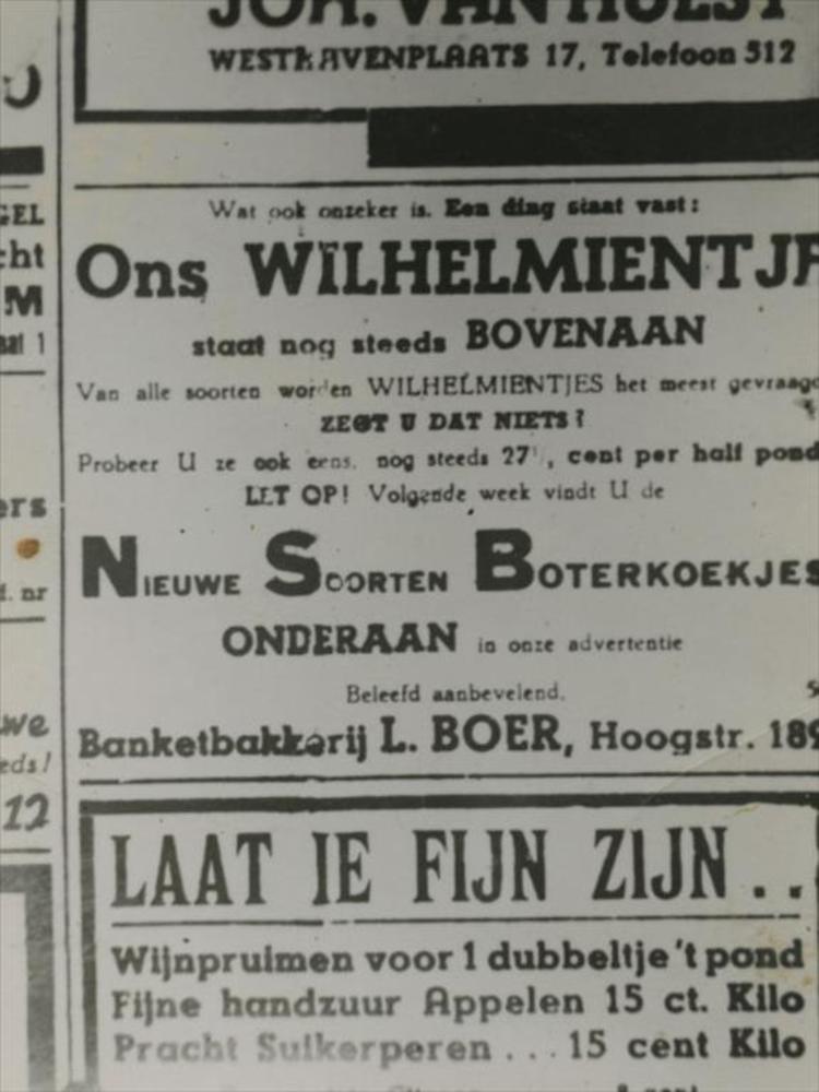 advertentie bakkerij L. Boer over Wilhelmientje koekjes