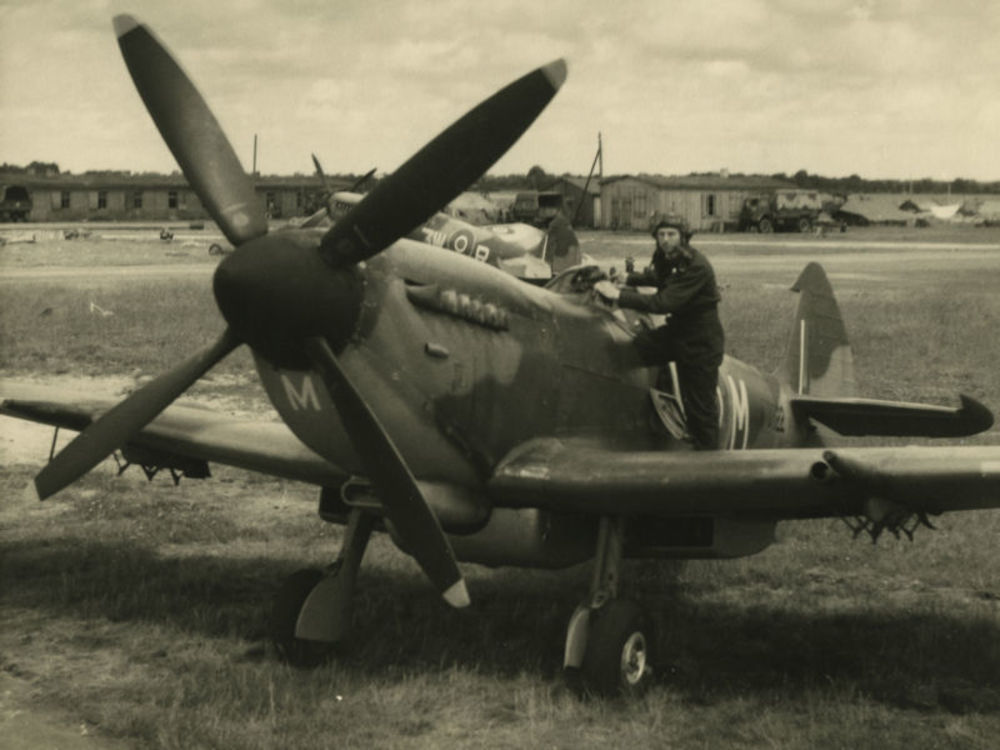 Foto piloot die aan boord van een Spitfire klimt (co...