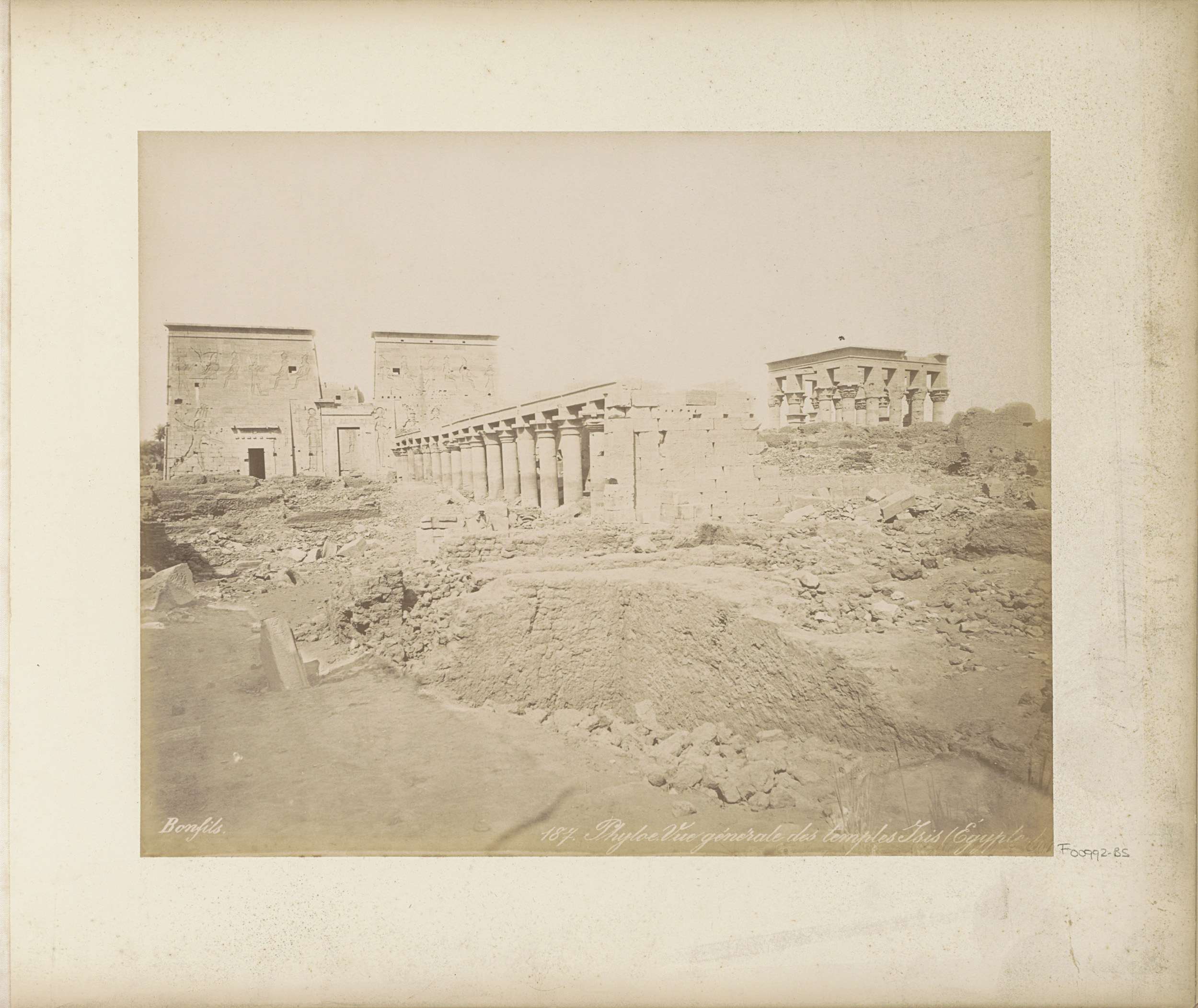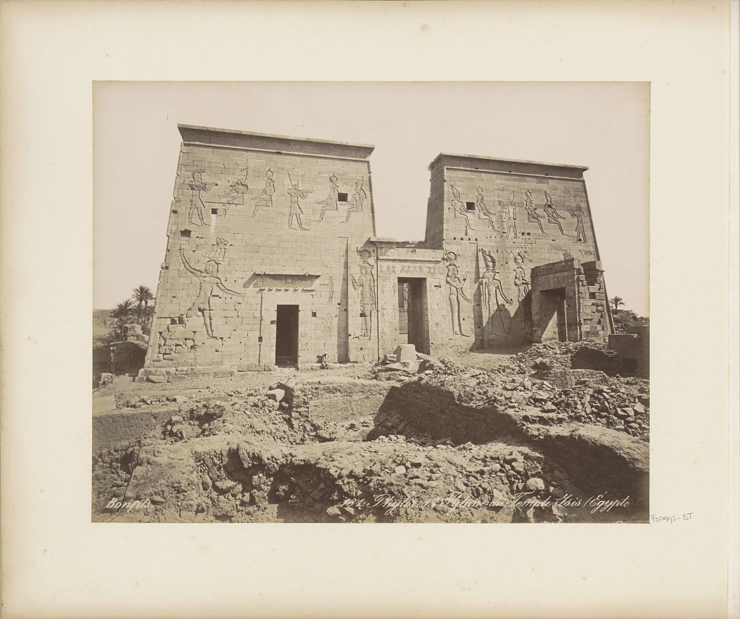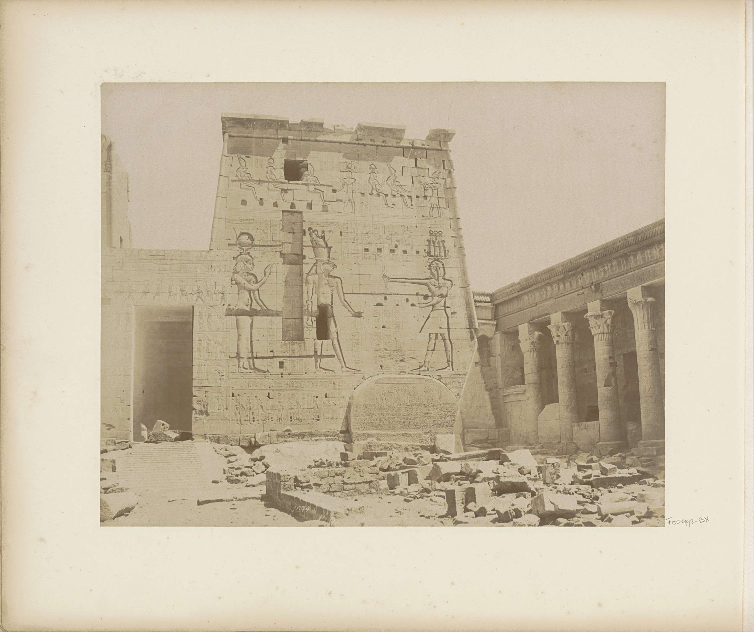 Eerste pyloon met reliëfs van de Tempel van Isis op ...