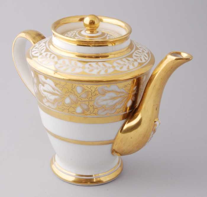 Witte theepot met goudkleurige banden en bloem-, eik...