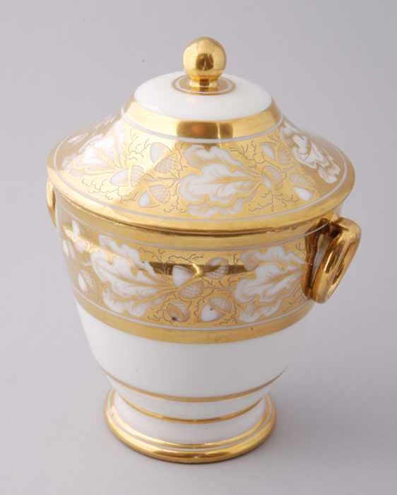 Witte suikerpot met goudkleurige bloem-, eikel- en b...