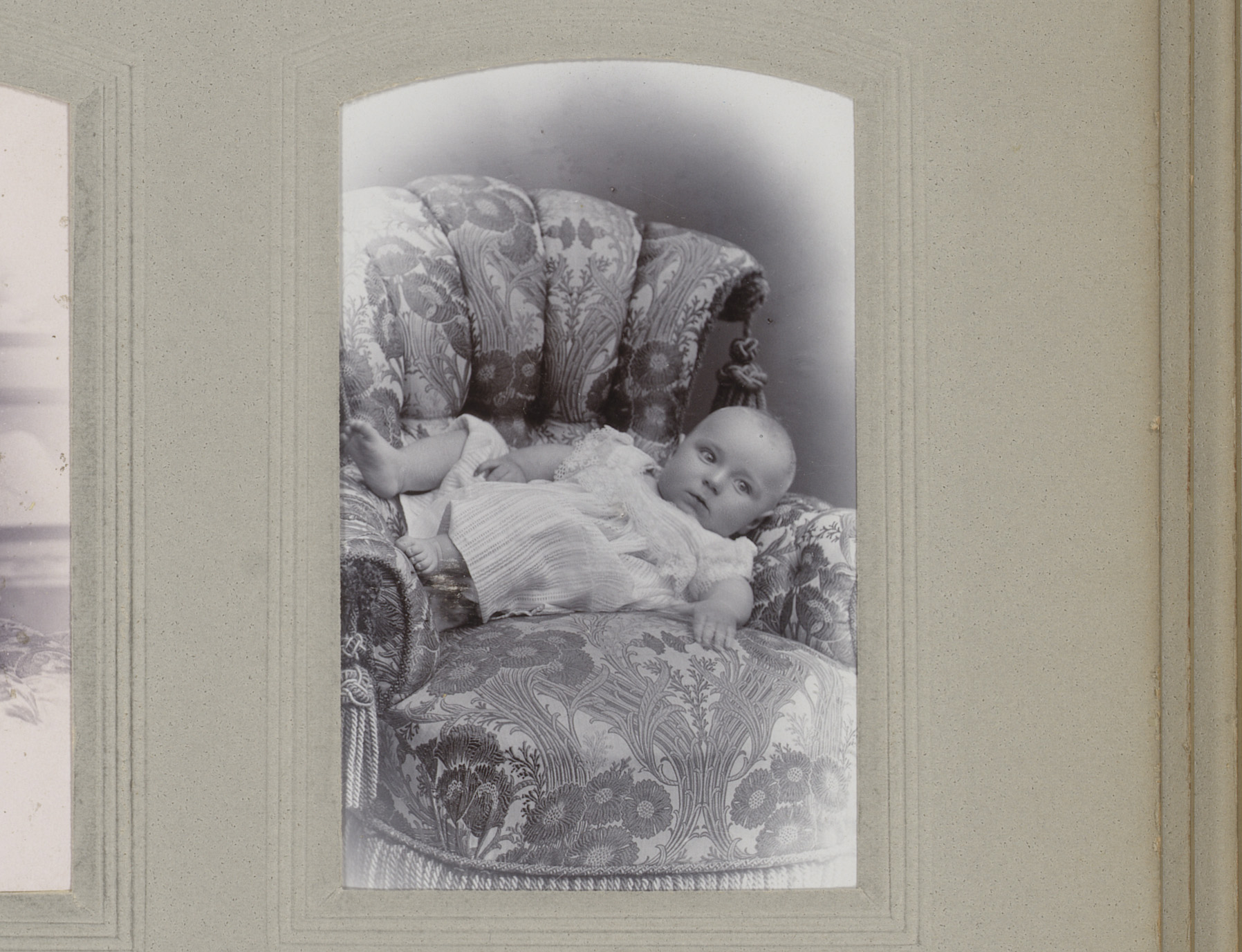 Portret van een baby, liggend in een stoel