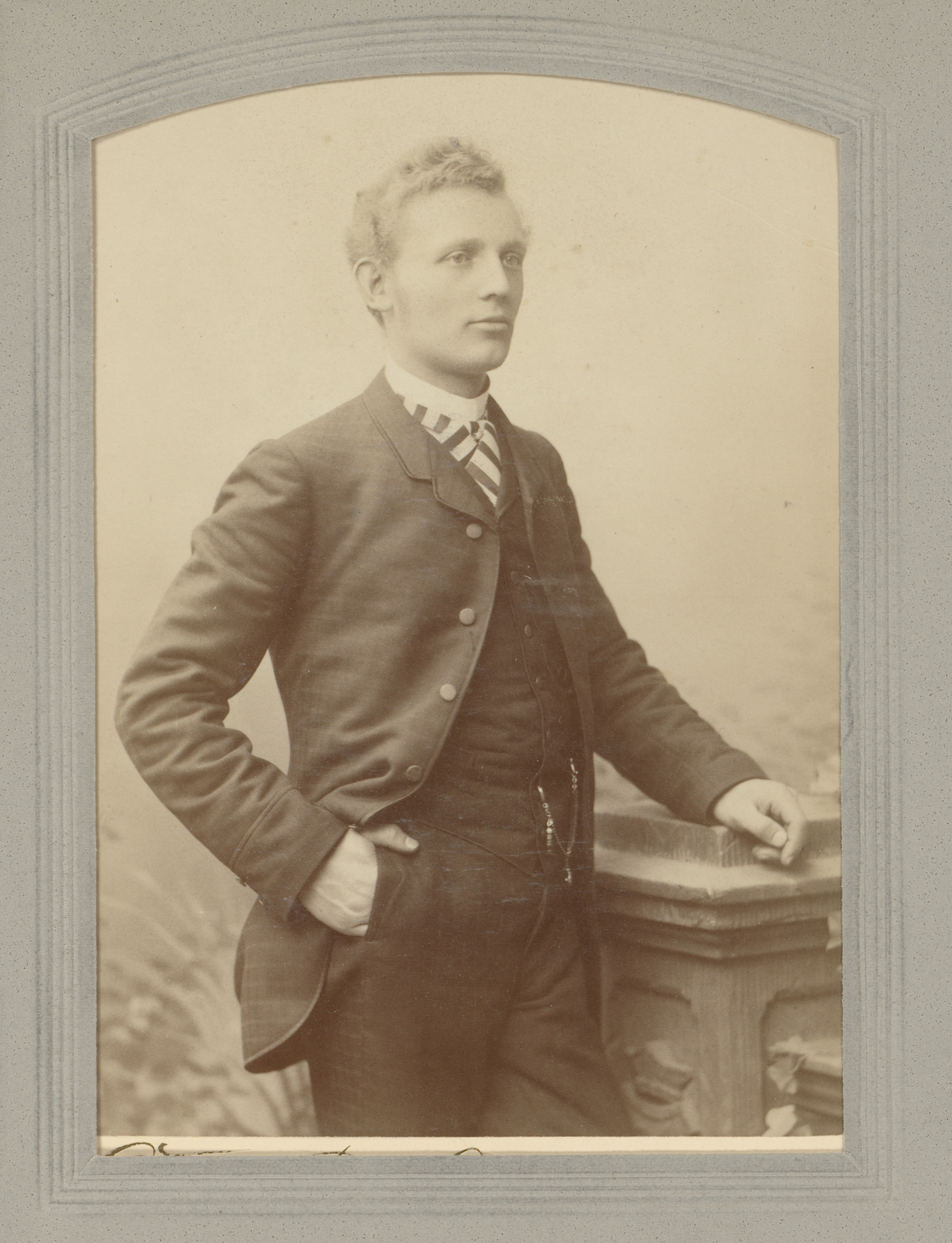 Portret van een man, staand bij een zuil