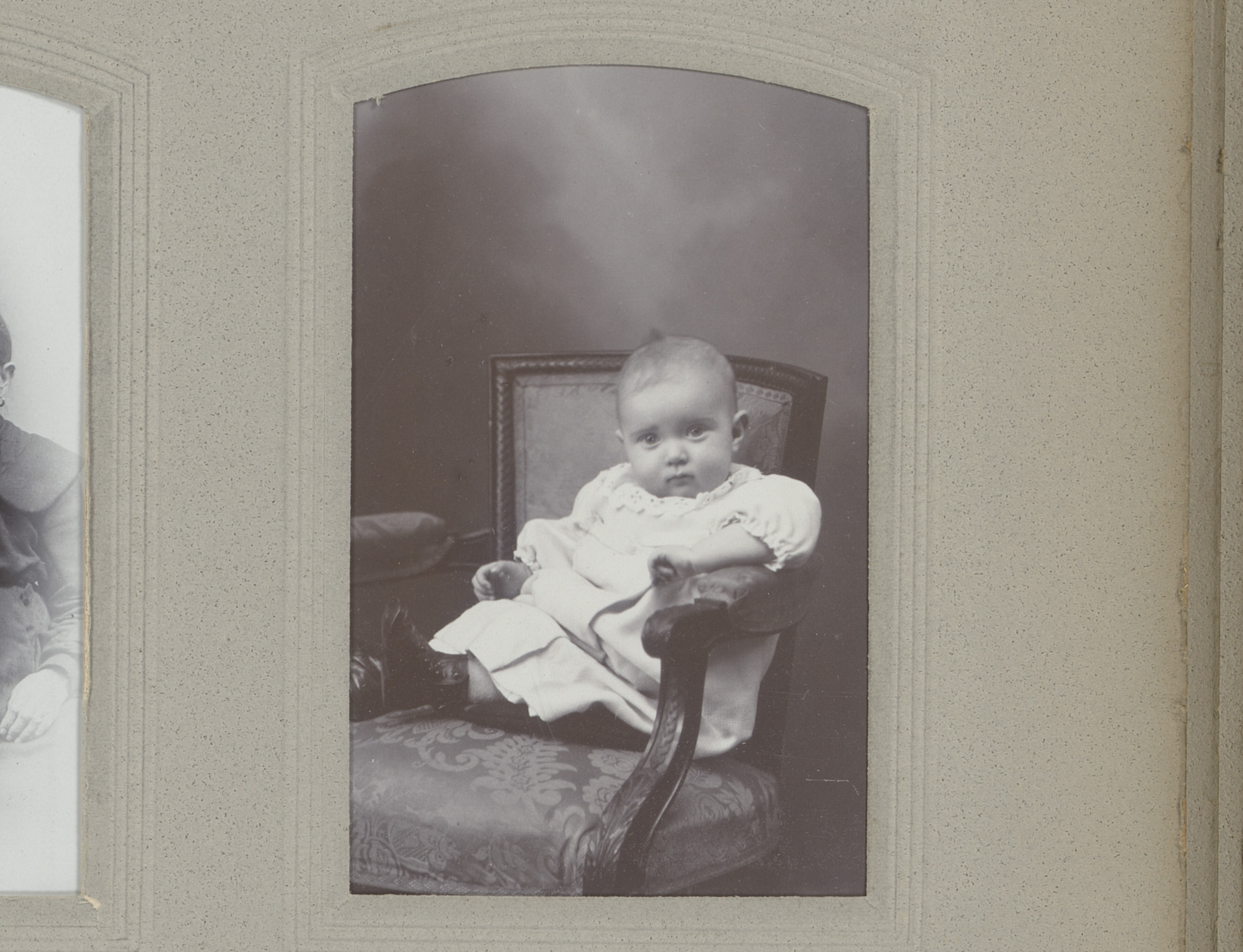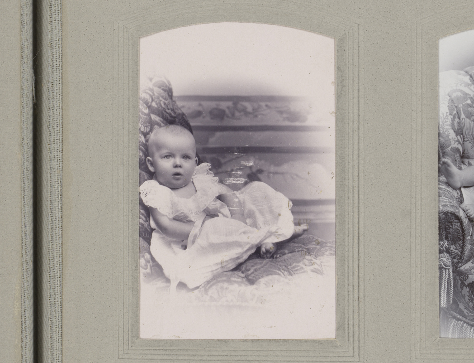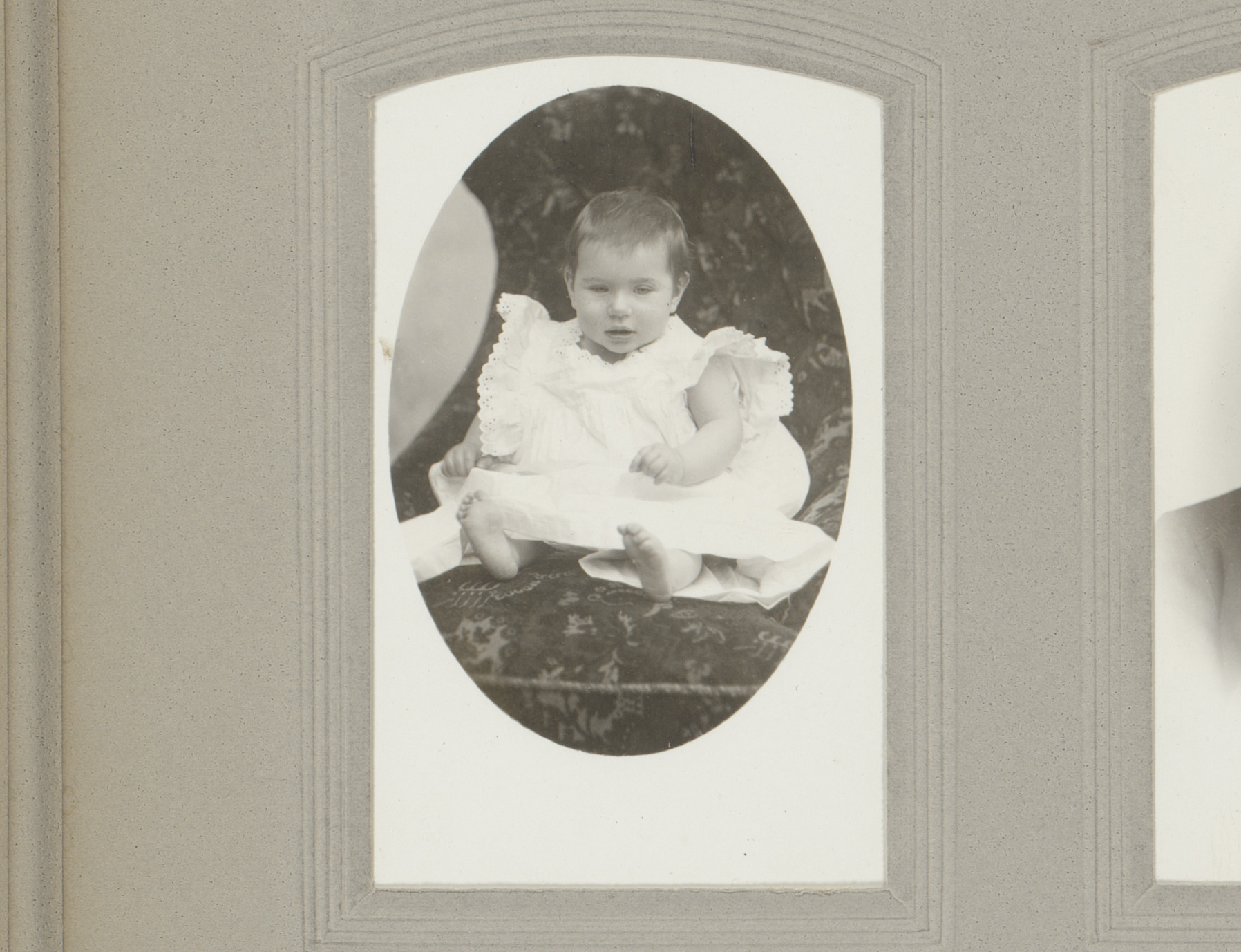 Portret van een zittende baby in witte jurk