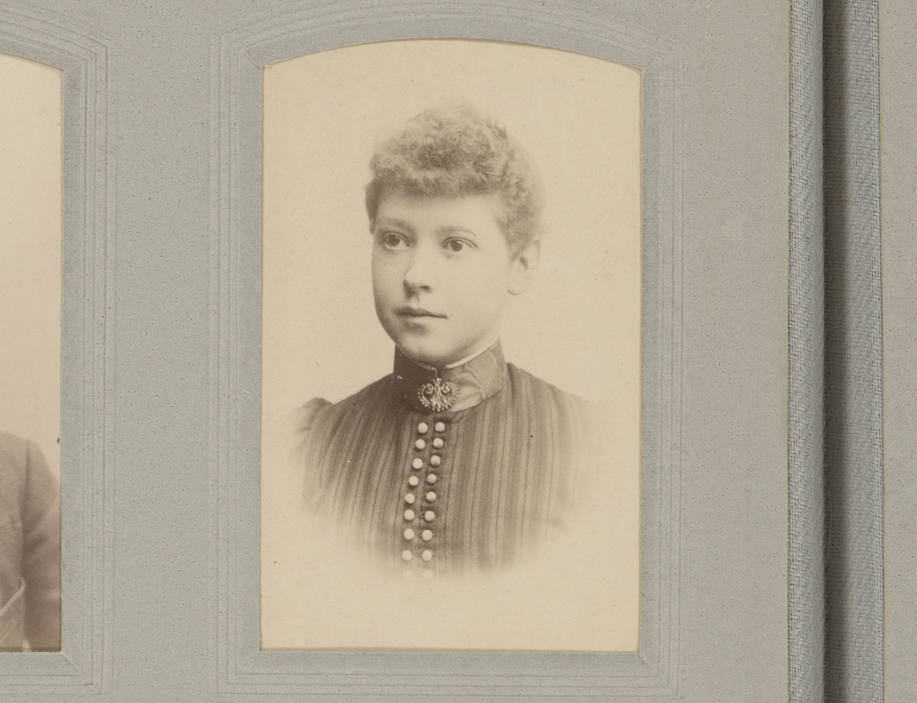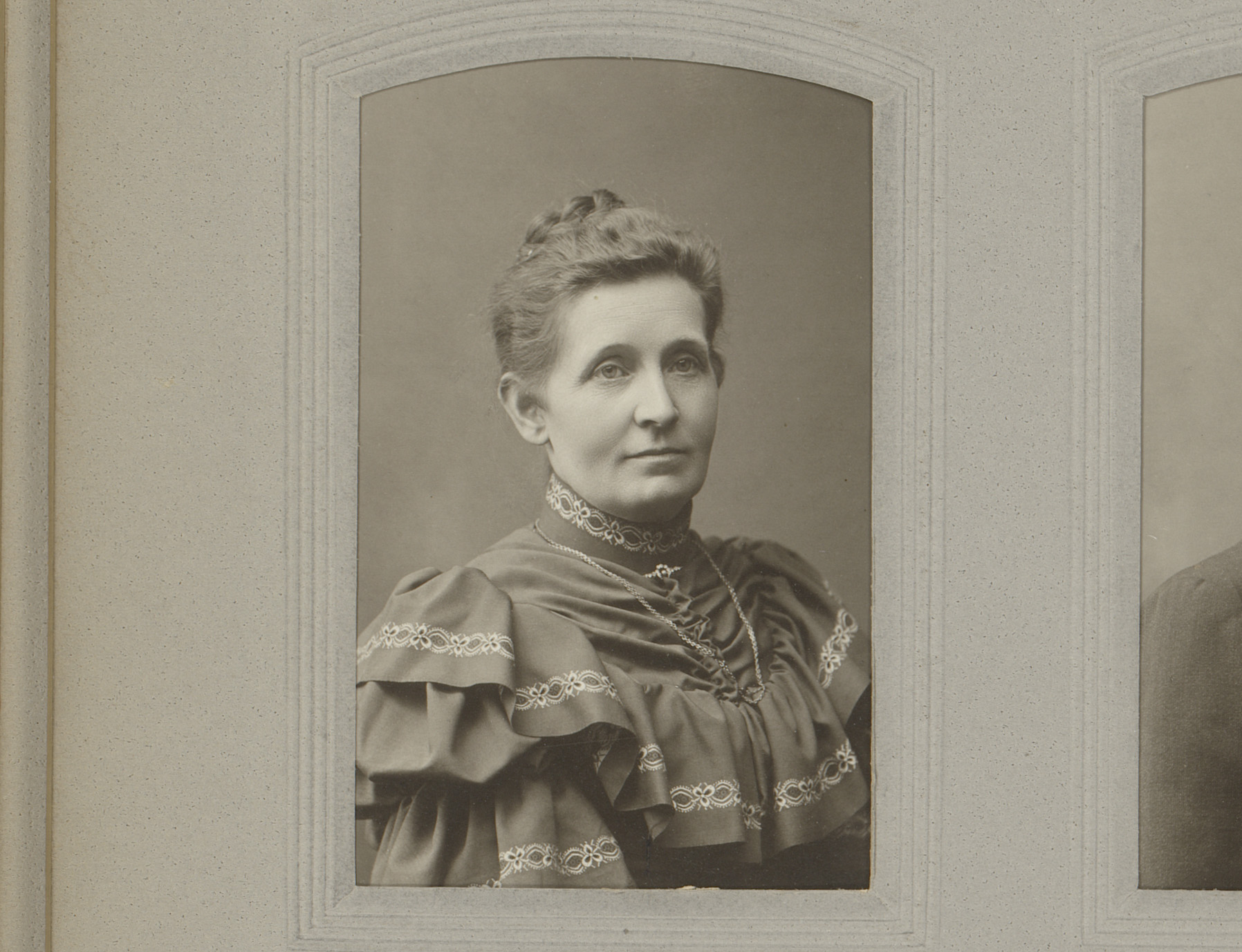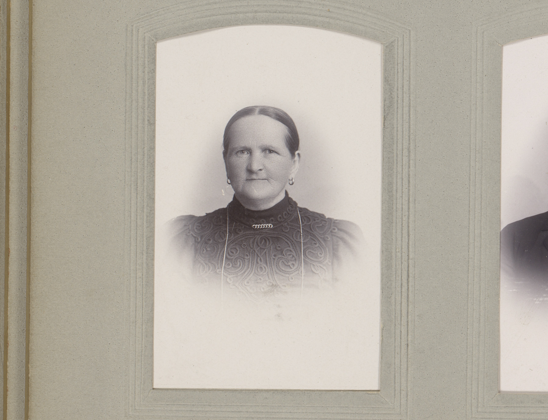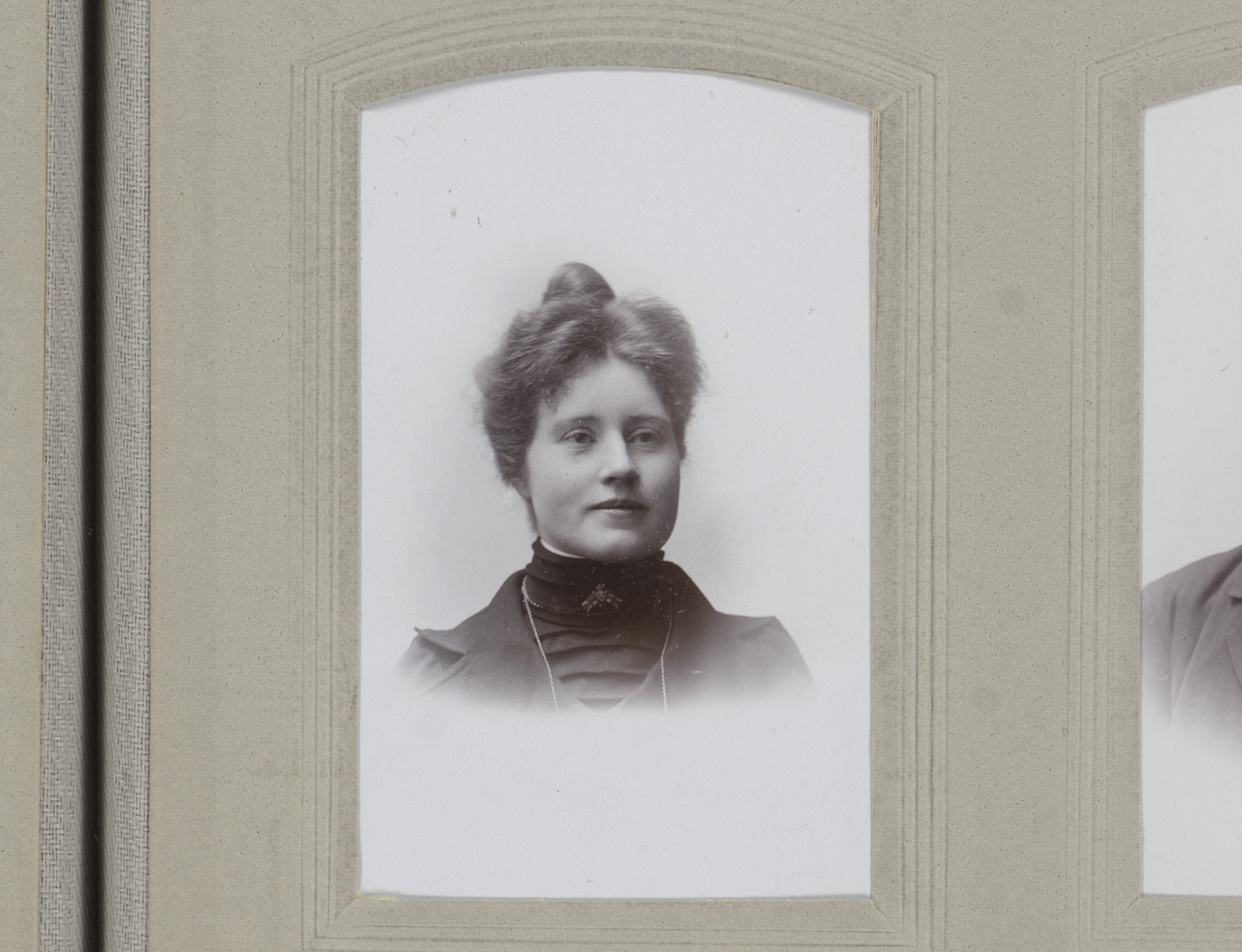 Portret van een vrouw in hooggesloten jurk met halsk...