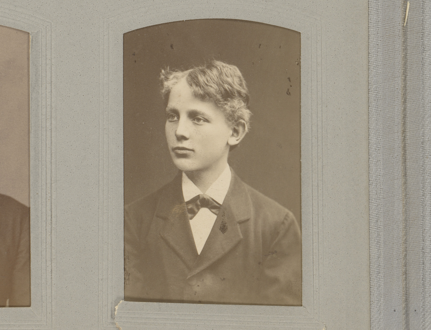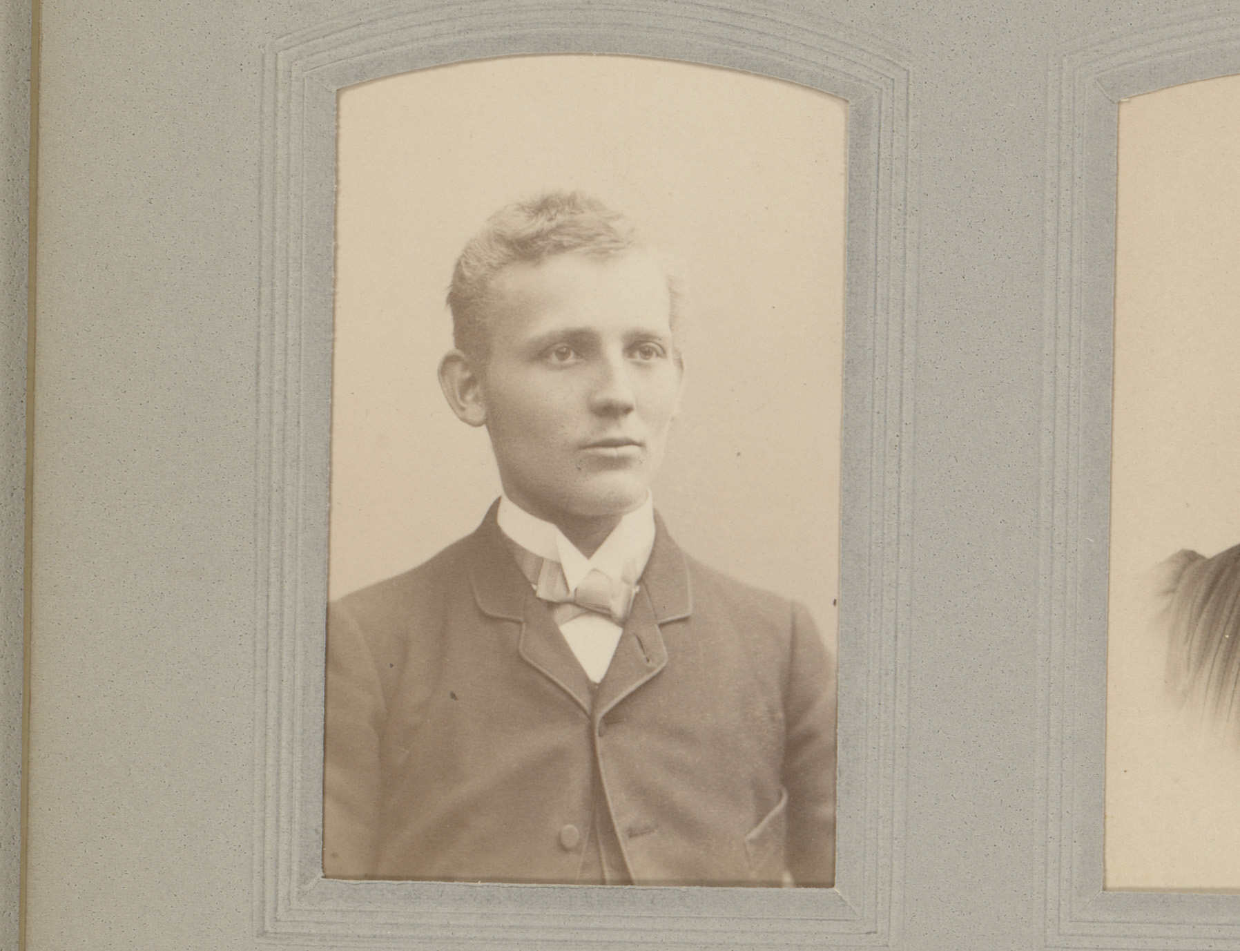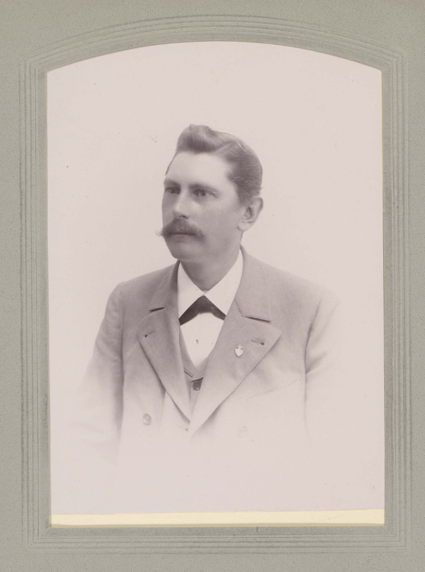 Portret van een man met vlinderstrik en twee insignes