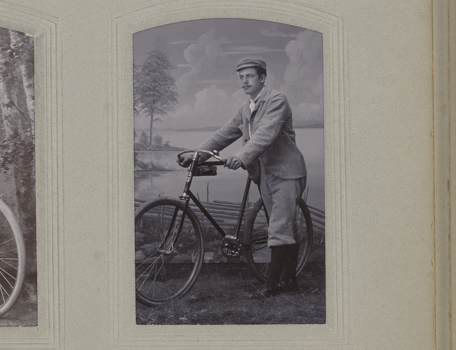 Portret van een man met fiets voor een decor