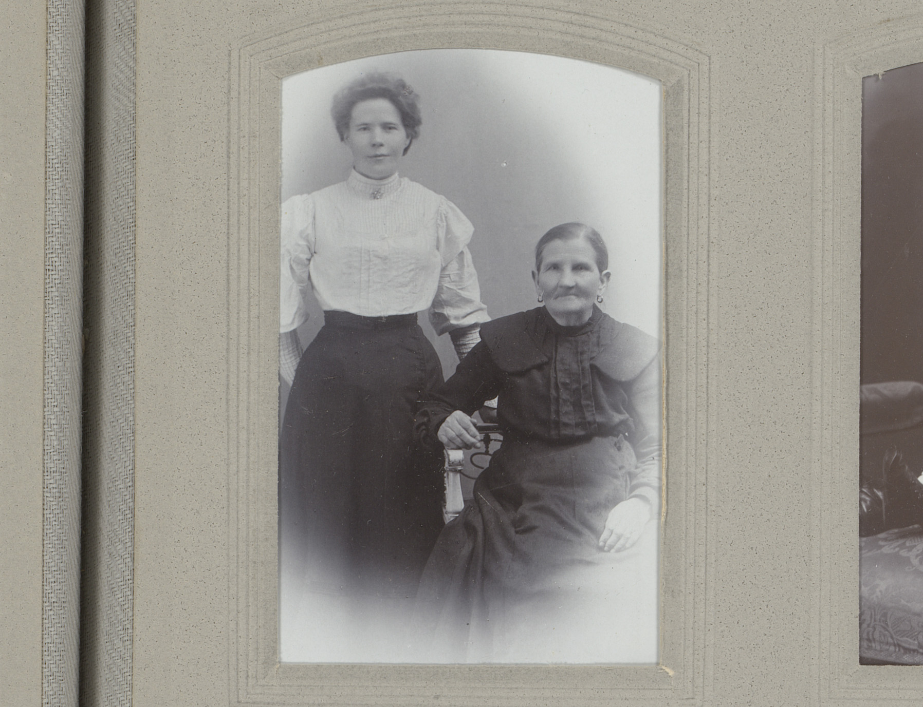 Portret van een staande vrouw en een zittende oude v...