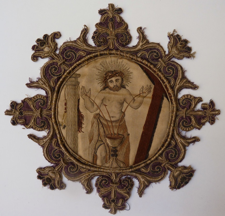 Rood kelkvelum met engelen met monstrans, met "Ecce ...